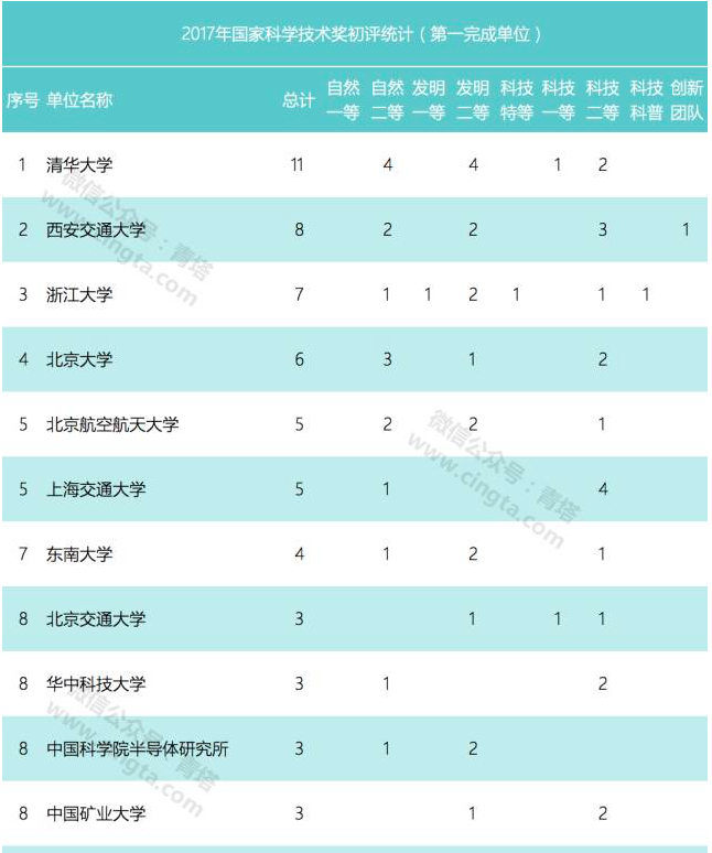从公布的初评结果上看,共有164家单位以第一完成单位完成的项目通过2017年国家科技奖初评。其中清华大学共计获得11项,位居第一;西安交通大学获得了8项,位居第二;浙江大学获得7项,北京大学获得6项;上海交通大学和北京航空航天大学各获得5项,东南大学获得4项,表现不俗。