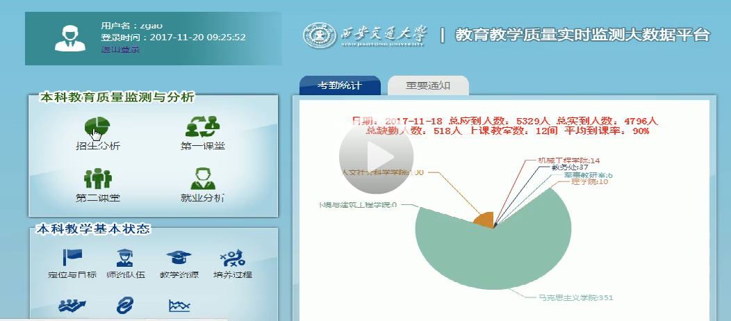 Aiming at solve four major problems (how to collect status of classroom, evaluate teaching, improve education quality, and serve students's learning) in classroom quality monitoring, this project first adopted advanced technologies, such as Internet of Things, Cloud computing, Big data, to collect the data and status related to teaching and learning in every classroom of Xian Jiaotong University; then, applied AI techniques, especially deep learning (CNNRNN, etc), NLP and Decision Science to evaluate the quality of teaching in classroom and mining out the issues and problems of teaching content and students' reviews; moreover, students are characterized via six dimensions (social relationship, consuming behavior, day routine, learning achievment, etc.) and guide their learning plan for future.
