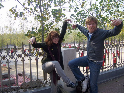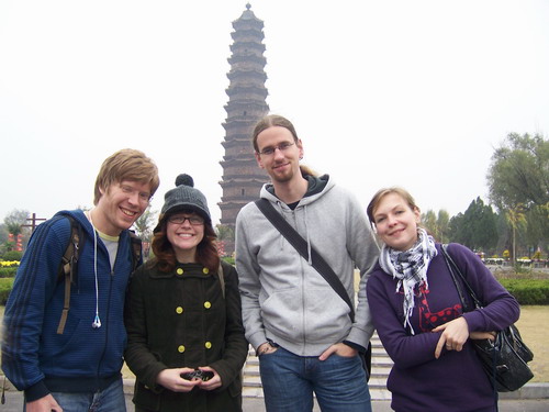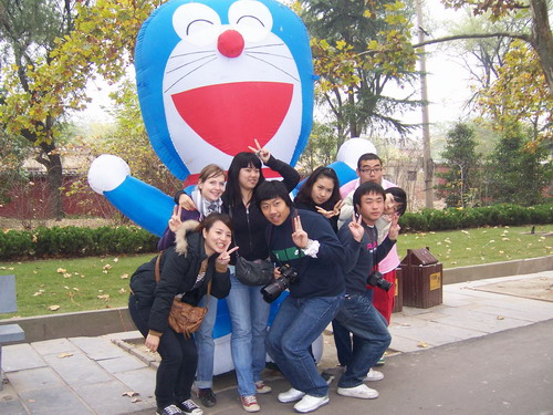 喜爱多啦A梦的同学们 开封铁塔前的开心留影。看看小魏同学是不是像个精灵?