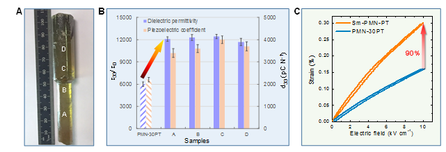 图A Sm-PMN-PT晶体照片 图B 晶体压电系数和介电常数 图C 晶体电致应变测试曲线