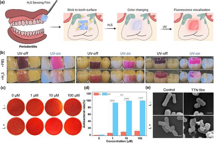 当接触H₂S时,TTN探针会发生显著的颜色变化,并在紫外光照射下呈现明显的荧光改变,从而实现“双信号”可视化检测,大幅提升检测的准确性与可靠性。基于该探针,研究团队进一步开发出一种实用性强、可高效监测H₂S的TTN薄膜传感器,利用这一薄膜有效实现了牙周炎的即时筛查和治疗。