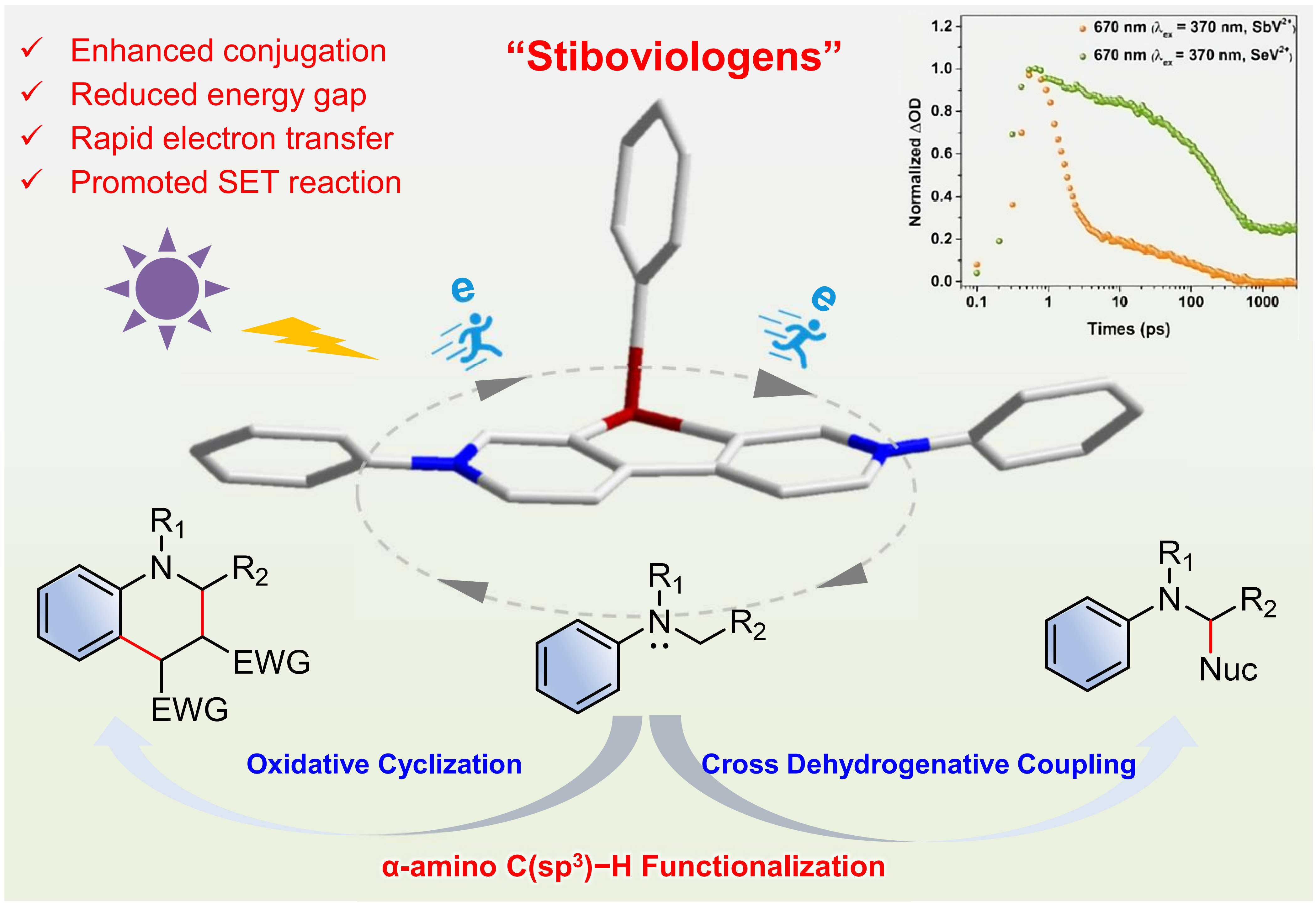 Ultrafast charge transfer of stiboviologens for electrochromism and visible light-induced α-amino C(sp3)–H functionalization.