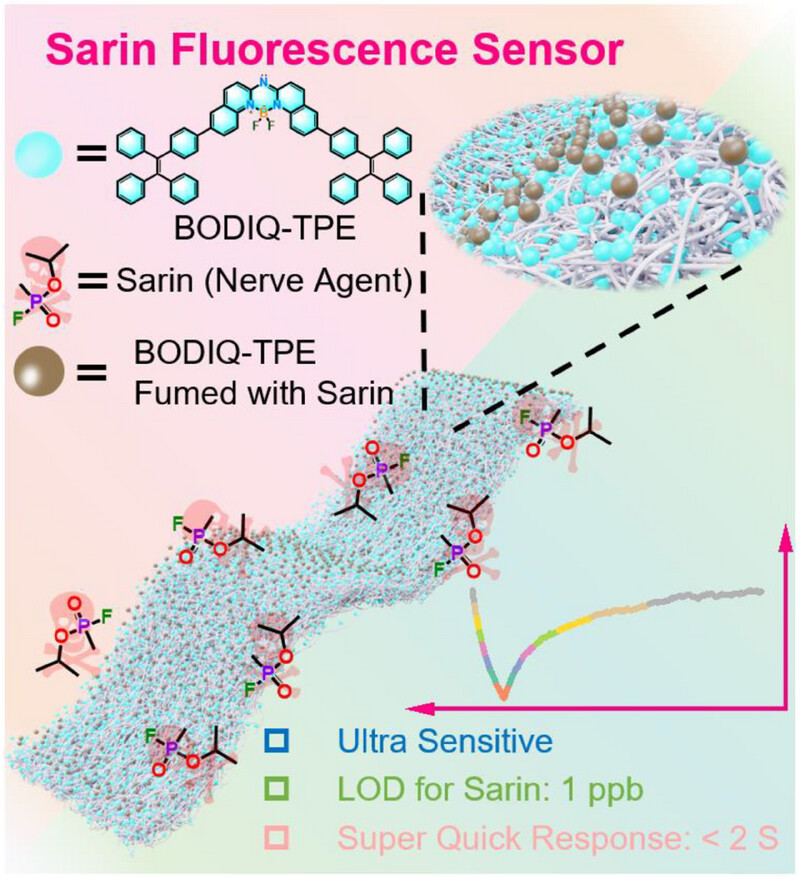 Dynamic response and discrimination of gaseous sarin using a boron-difluoride complex film-based fluorescence sensor.