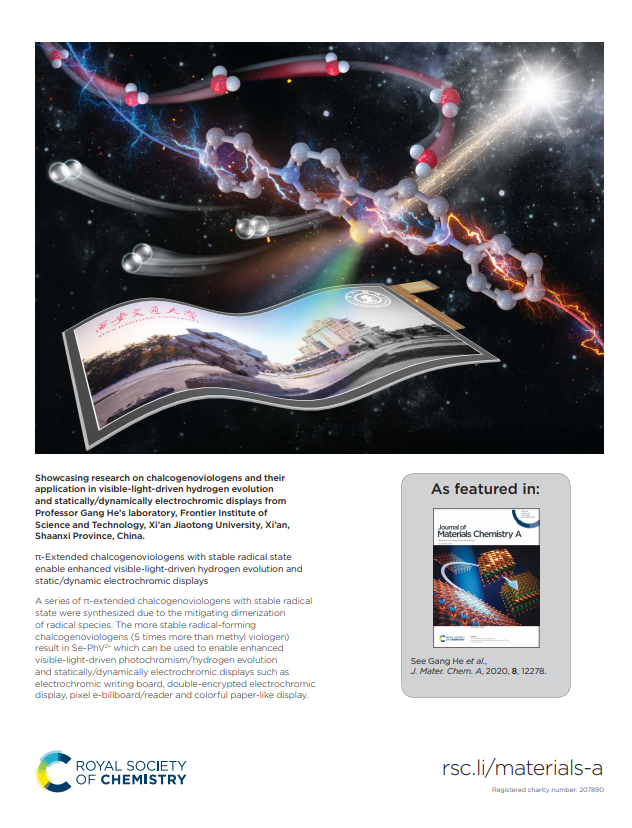 36. Guoping Li, Ruitong Song, Wenqiang Ma, Xu Liu, Yushuo Li, Bin Rao and Gang He*, π-Extended chalcogenoviologens with stable radical state enable enhanced visible-light-driven hydrogen evolution and static/dynamic electrochromic displays.J. Mater. Chem. A, 2020, 8, 12278-12284. Back Cover Paper!