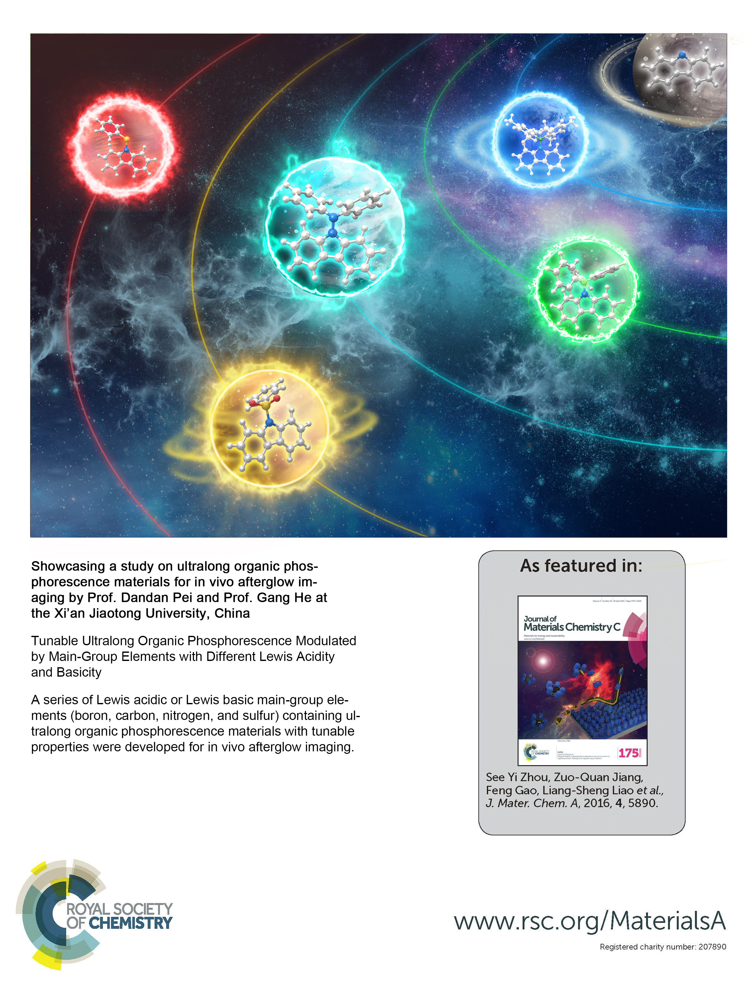 35. Letian Xu, Kun Zhou, Huili Ma, Anqi Lv, Dandan Pei, Guoping Li, Yanfeng Zhang, Zhongfu An, Ang Li, Gang He*, Ultralong Organic Phosphorescent Nanocrystals with Long-Lived Triplet Excited States for Afterglow Imaging and Photodynamic Therapy.ACS Appl. Mater. Interfaces 2020, 12, 18385-18394.34. Zhicheng Zhang,* Jie Xiong, Gang He, Dongfeng Dang, Yunchuan Xie and Qing Wang*, Fluorous effect-induced emission of azido substituted poly(vinylidene fluoride) with high photostability and film formation. Polym. Chem. 2020,11, 1307-1313.