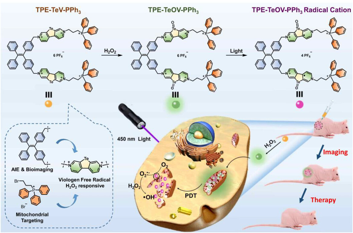 Cationic telluroviologen derivatives as type‐I photosensitizers for tumor photodynamic theranostics.