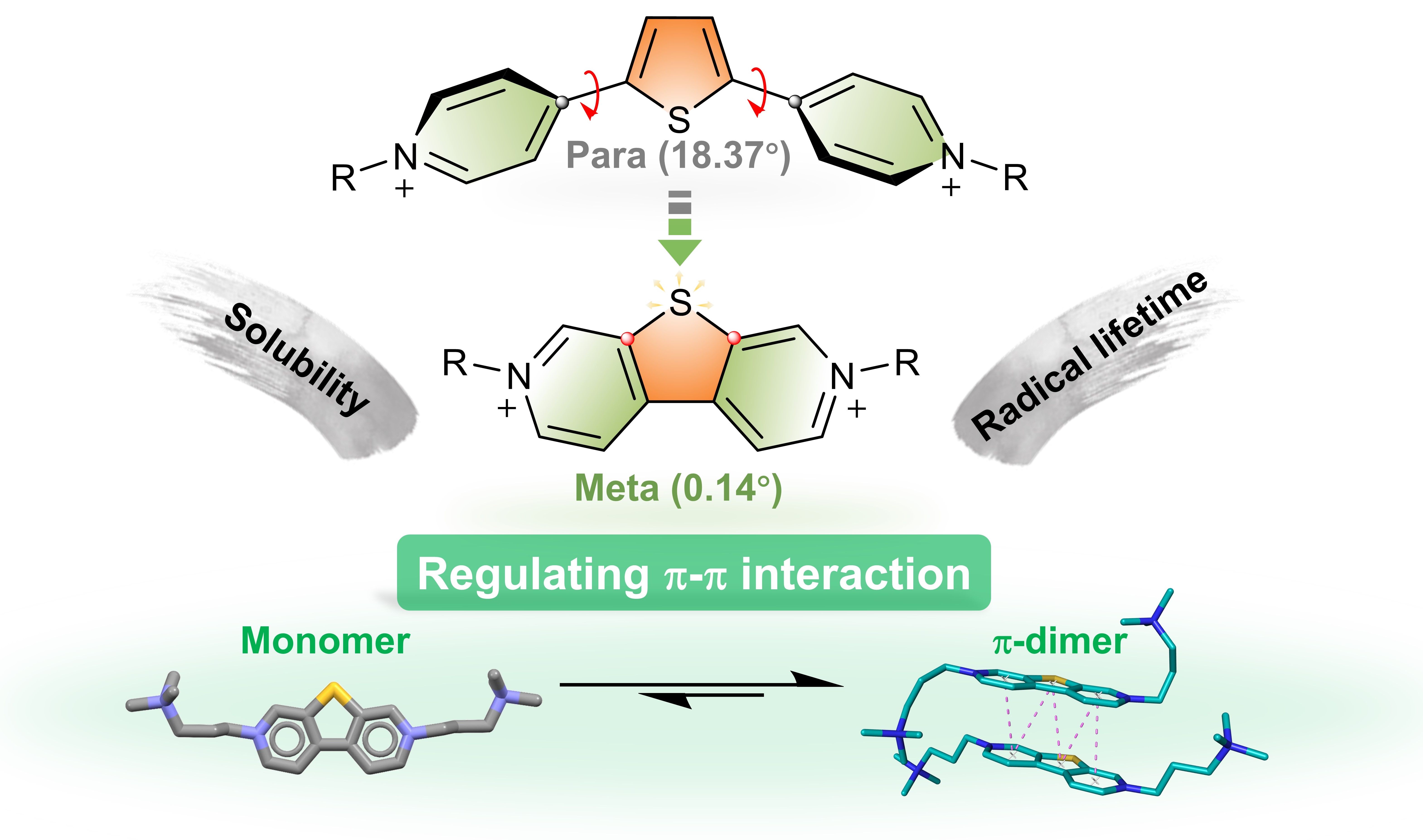 Meta-substituted thienoviologen with enhanced radical stability via π-π interaction modulation for neutral aqueous organic flow batteries.