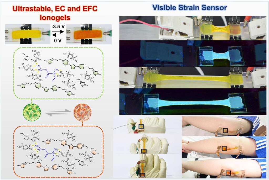 Ultrastable Viologen Ionic Liquids-based Ionogels for Visible Strain Sensor Integrated with Electrochromism, Electrofluorochromism and Strain Sensing.