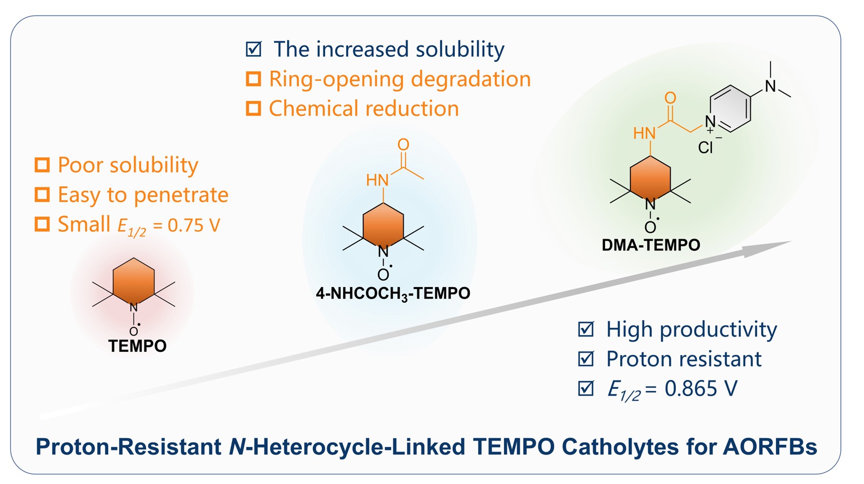 88. Yujie Zhao, Dr. Xu Liu, Zengrong Wang, Jiapeng Huang, Junjie Huang, Xiaotong Deng, Xuri Zhang, Heng Zhang, Haiyan Yu, Prof. Dr. Ya-Ke Li, Prof. Dr. Gao-Lei Hou, Gang He*. Proton-Resistant N-Heterocycle-Linked TEMPO Catholytes for Long-Lasting Neutral Aqueous Organic Redox Flow Batteries.