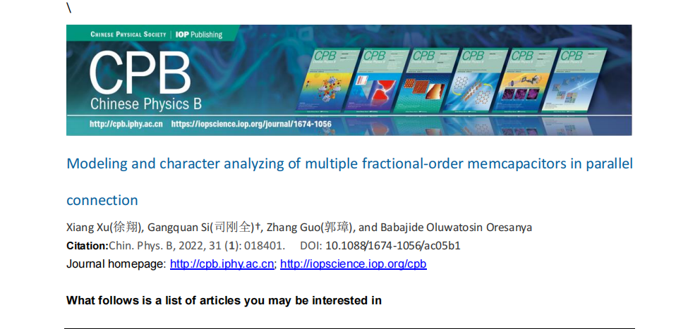由博士研究生徐翔、郭璋和Babajide完成的论文 Modelling and Character analyzing of multiple fractional-order memcapacitors in parallel connection 被Chinese Physcis B录用并发表,该论文介绍了课题组在分数阶忆容器并联电路的建模和特性分析方面取得的研究成果,论文研究受到国家自然科学基金项目资助(52077160)。