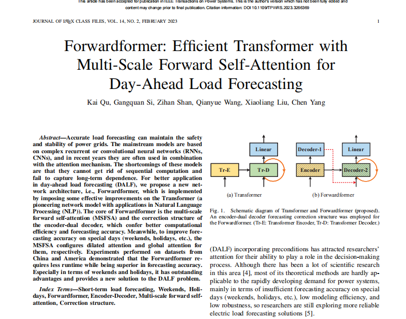 由曲凯、山子涵、王倩月等撰写的论文“Forwardformer: Efficient Transformer with Multi-Scale Forward Self-Attention for Day-Ahead Load Forecasting”被电力领域权威期刊IEEE Transactions on Power System(2022影响因子:7.326)录用并发表,该论文针对电力系统负荷预测问题,提出一种全新的Forwardformer网络,大幅度提高了负荷预测准确性及计算效率。