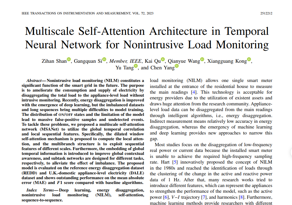 由山子涵、司刚全、曲凯、王倩月、孔祥光、唐雨、杨晨等撰写的论文“Multiscale Self-Attention Architecture in Temporal Neural Network for Nonintrusive Load Monitoring ”被测量威期刊IEEE Transactions on Instrumentation and Measurement(2022影响因子:5.332)录用并发表,该论文针对电力非侵入式负荷检测,提出一种全新的MSANet(Multiscale self-atention network)网络,大幅度提高了用电负荷辨识的准确性。