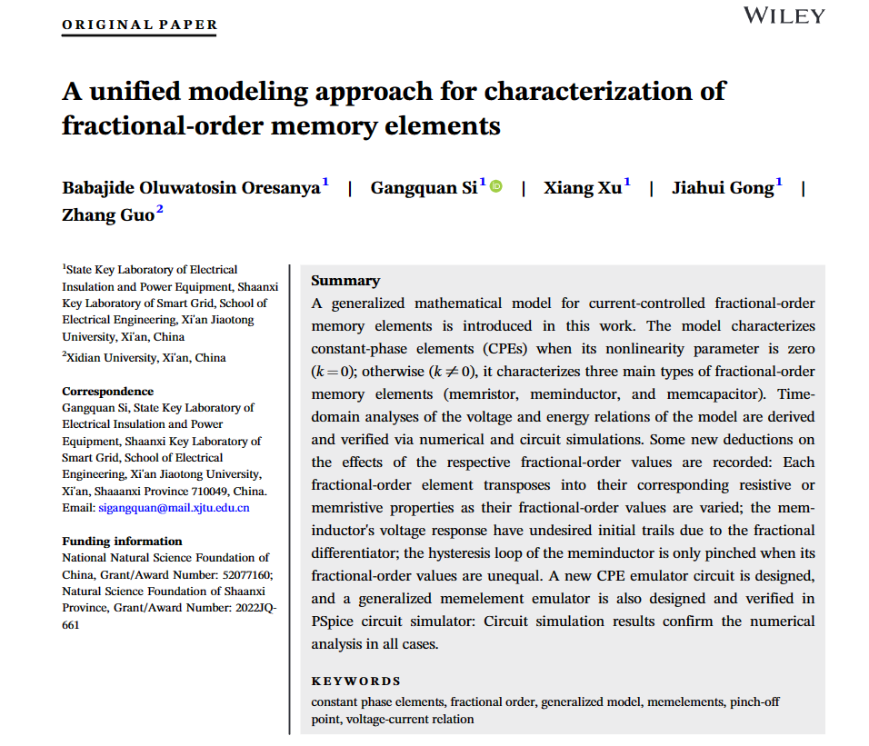 论文引用信息:Oluwatosin Oresanya B, Si G, Xu X, Gong J, Guo Z. A unified modeling approach forcharacterization of fractional-order memory elements.Int J Circ Theor Appl. 2023;1‐14. doi:10.1002/cta.3652