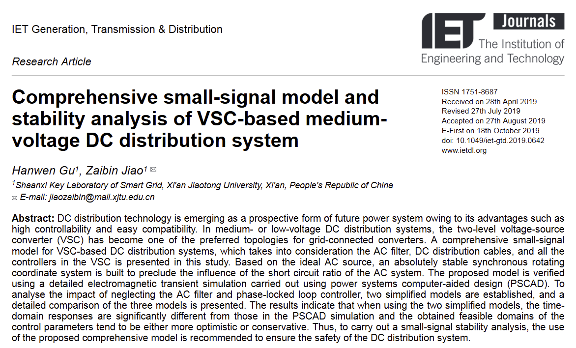 • Title of Paper:Comprehensive Small‐Signal Model and Stability Analysis of VSC‐Based Medium‐Voltage DC Distribution System