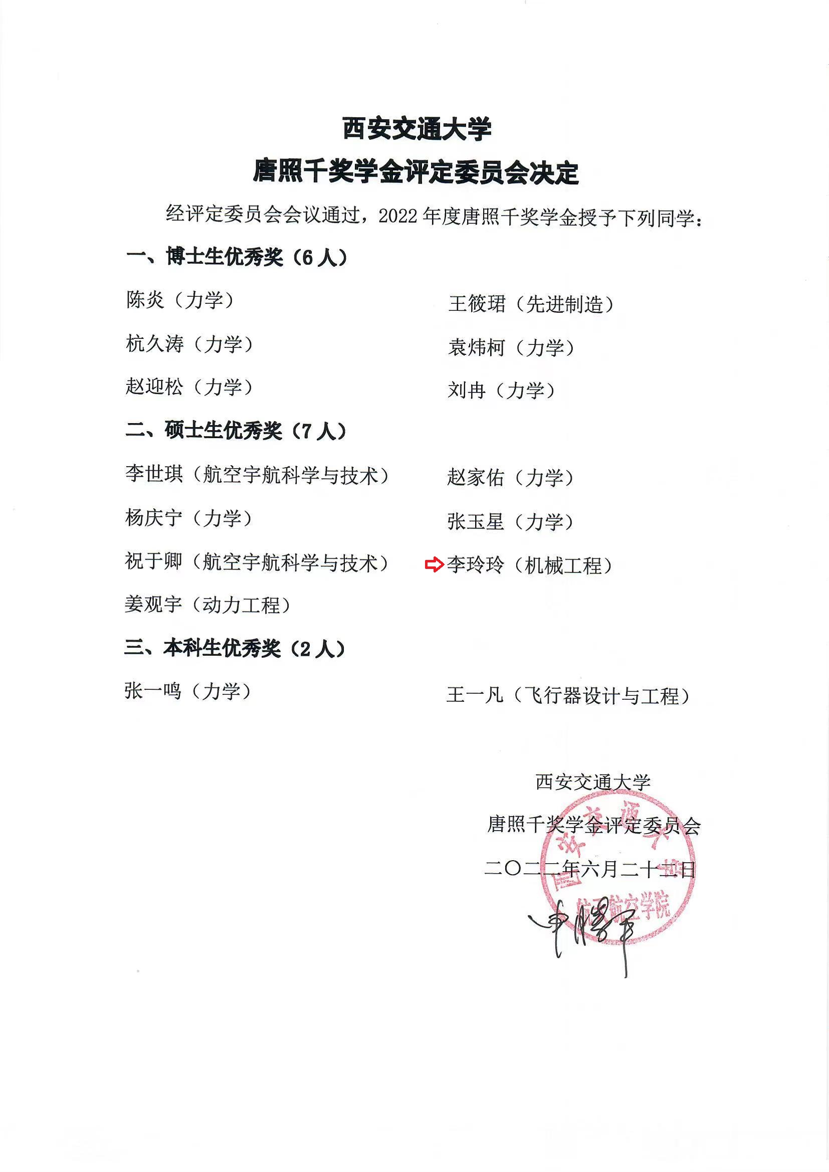 - 祝贺李玲玲同学获得“唐照千奖学金”