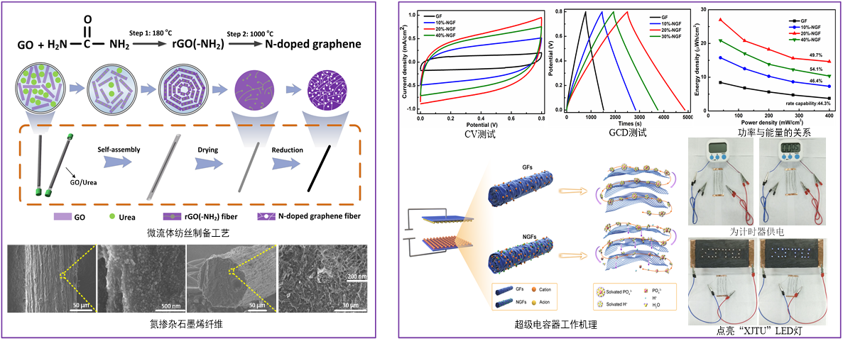 纤维微型超级电容器主要应用于高性能可穿戴电子器件的柔性供电单元中,要求其轻、薄且具有柔性,目前构筑具有大能量储存的纤维材料为可穿戴器件供能是迫切需求。针对目前石墨烯纤维材料的不均匀性和少孔性,并导致其制备的微型超级电容器能量密度低等问题,提出基于介孔结构氮掺杂石墨烯纤维的可控制备工艺方法,探索实现器件大能量密度输出性能的工艺途径。与国际上同类型石墨烯纤维超级电容器相比,基于该纤维构筑的超级电容器所表现的比电容、能量密度均创国际新高。