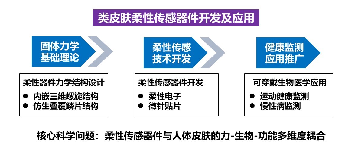 大力发展健康监测、全方位保障人民健康是现阶段国家的重大战略需求,将其与可穿戴技术这一世界科技前沿结合,开发可穿戴智能柔性传感平台,实现个体健康监测,对于疾病防控、提高人类生活质量和健康水平具有重要意义。作为可穿戴传感的核心,柔性传感器件具有轻薄、贴肤、可变形的特点,成为近年来学术领域的研究热点。不过,现阶段柔性器件研究仍面临器件-皮肤之间耦合机制不明、器件穿戴舒适度不佳、力学稳定性不足、多功能集成度不高、人-机黏附不强等挑战。针对以上问题,本团队在课题开展中遵循“基础理论-技术开发-应用推广”的学术思路,围绕柔性传感器件与人体皮肤力-生物-功能多维度耦合的核心科学问题,交叉融合固体力学、材料学、电子学、生物医学等学科知识,从力学结构设计、功能材料制备、柔性器件开发、健康监测应用四个方面,开展了柔性传感器件开发及其可穿戴应用的研究(图1)。