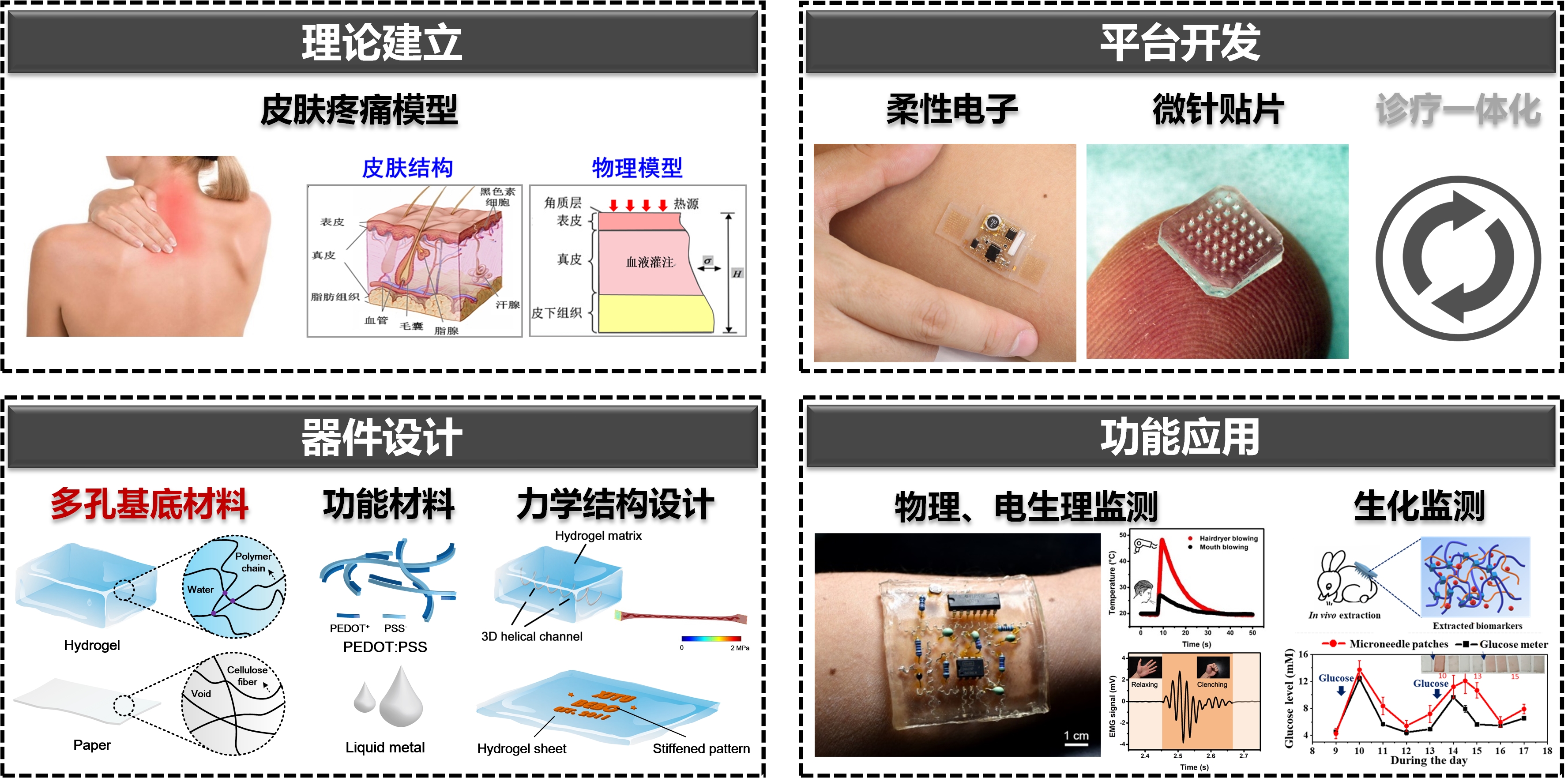 具体研究内容围绕以下几个方面展开(图2):(1)理论建立:基于团队前期在皮肤组织热-力-电多场耦合研究中的坚实基础,建立皮肤疼痛的数理模型,探索柔性器件与人体皮肤的多维度耦合机制,评估器件穿戴舒适度,指导器件开发设计中的材料选择;(2)平台开发:面向世界科技前沿,开发类皮肤柔性电子与微针贴片两大传感平台,通过人体正常的传导、代谢,于体表、皮下对物理、电生理、生化指标进行采集分析,并以开发”诊疗一体化“技术为下一目标;(3)器件设计:基于生物友好、黏附性佳的基底、界面材料(如水凝胶),结合新型功能材料、力学结构设计与先进制造工艺,开发高性能、集成化的传感器件;(4)功能应用:深入了解临床需求,搭建面向人体健康指标监测的类皮肤柔性传感平台,探索其在可穿戴运动监测与慢病管理中的应用前景。