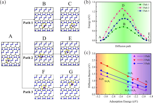 电池存在于我们日常生活的各个方面,是现代科学技术社会不可缺少的一部分。由于其高的硫的理论容量(约1675 mAh g-1),锂硫电池已成为一种具有很高发展前景的电化学储能装置。然而,尽管在过去的三十年里,人们对锂硫电池进行了广泛的研究,锂硫电池的商业化仍受到快速容量衰减和严重自放电的阻碍。当LiPSs与电池电解质溶剂之间的相互作用强于LiPSs与电极材料之间的相互作用,LiPSs将会溶解于电解质中。这些溶解的LiPSs在阴极和阳极之间来回穿梭,导致电池容量衰减和低库仑效率。采用合适的锚固材料来捕获LiPSs,可以有效减弱这种穿梭效果。本文利用结构搜索,成功探索了一种新型C4N4单层并研究了其几何结构、输运性质和电子性质。利用范德华相互作用系统地研究了C4N4单层作为锂硫电池锚定材料的潜力。吸附计算表明,LiPSs在C4N4单层表面发生化学吸附,其吸附能大于锂多硫化物在电池电解液中的吸附能,这意味着C4N4单层可以抑制锂硫电池的穿梭效应,从而显著改善锂硫电池的循环性能。而且,LiPSs在C4N4单层上的良好表面扩散赋予了快速的充放电速率。由于C4N4单层一种拥有0.618 eV直接带隙的半导体,为了提高C4N4单层的导电性,构建了C4N4/graphyne异质结构。通过计算,结果表明,异质结构体系具有零带隙,显著提高C4N4单层本身的电导性质。在之后的吸附研究中,发现LiPSs在异质结构上的吸附能与在原始结构上的吸附能差别不大,这表明C4N4/graphyne异质结构可以在不影响C4N4单层对LiPSs吸附能力的情况下提高C4N4单层材料电导性能。基于这些结果,可以认为C4N4单层可以有效的阻碍锂硫电池穿梭效应。研究结果促进了二维碳氮材料用于锂硫电池的理论研究。