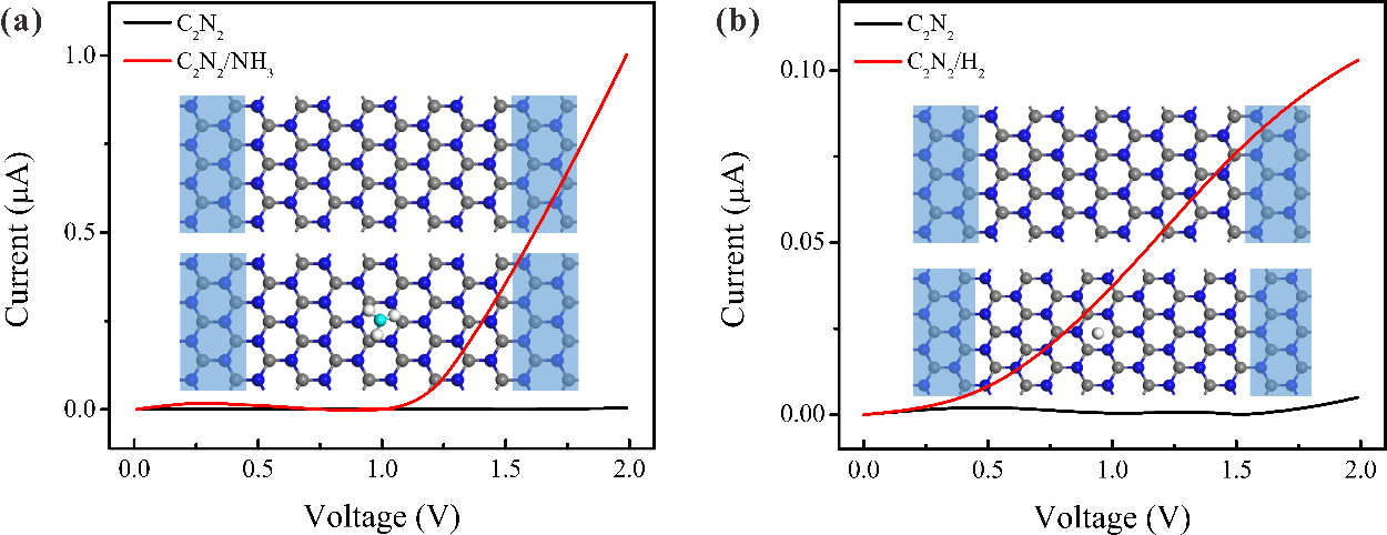 NH3是一种有毒化合物,会烧伤皮肤、眼睛和呼吸器官的粘膜。如果人们吸入过多的NH3,会导致肺部肿胀甚至死亡。另一方面,NH3可用于生产液氨、氮肥(如尿素、碳酸铵等)、复合肥、硝酸、铵盐、纯碱等。并且,可以广泛应用于化工、轻工、化肥、医药、合成纤维等领域。更重要的是,NH3还可以用作生物燃料,为汽车提供能量。因此,为了保护人类健康,控制大气环境,实现工业应用,寻找一种有效的氨气检测和捕集方法是十分必要的。我们通过第一性原理,研究了吸附在α-C2N2纳米片上的不同气体分子(CO、CO2、H2、NO2、NH3、O2、N2、SO2和CH4)的结构稳定性、电子性质和力学性能。在这9种吸附体系中,NH3(0.014 e-)在α-C2N2上的电荷转移量最大。故NH3在实验中更容易被检测出来。此外,NH3在α-C2N2纳米片上的吸附能为-0.280 eV,表明NH3更容易从α-C2N2中解吸出来。而且,我们发现在从VE=-0.6 V/Å到VE=+0.3 V/Å,NH3在α-C2N2纳米片上的吸附能在-0.83 eV~ -0.24 eV之间变化。因此,通过控制VE,,α-C2N2纳米片具有作为高灵敏度、高选择性NH3传感器的潜力。更重要的是,NH3在α-C2N2纳米片上吸附前后的I-V曲线发生了显著变化,这意味着NH3在实际应用中可以直接测量。