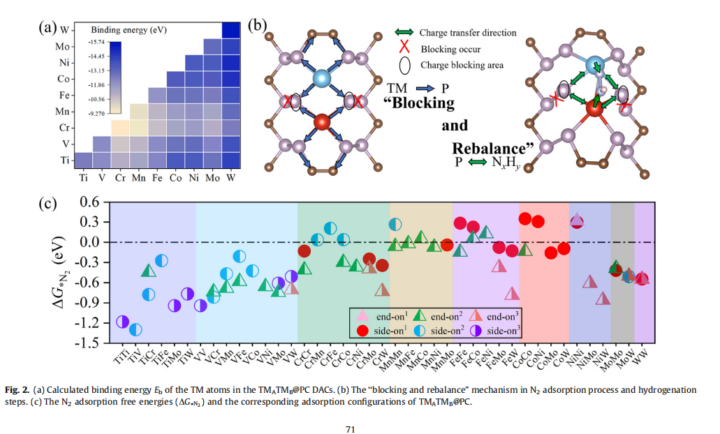 与单原子催化剂(SAC)相比,双原子催化剂(DAC)的引入具有重要意义-对提高电催化氮还原反应效率有积极作用(NRR),它为Haber-Bosch工艺提供了一种环境替代方案。然而,研究关于设计双金属组合以获得更好性能的机制和策略仍在研究中其早期阶段。在此,基于“闭锁和再平衡”机制,45种双金属对组合掺杂a-磷碳化物(TMATMB@PC)通过密度研究了其作为高效NRR催化剂的性能函数理论和机器学习方法。经过多步筛选后,