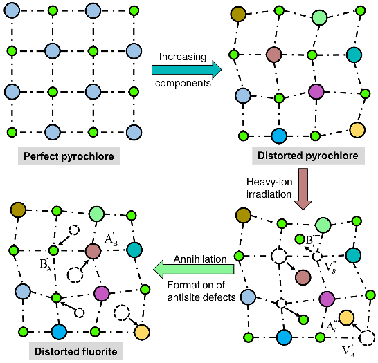 内容: 随着人们对清洁能源需求的日益增加,核能作为一种可再生的清洁能源得到了大力的发展。然而安全地处置由核能产生的高放射性废物(特别是锕系元素,被称为核废物中最危险和寿命最长的成分)严重的制约了核能的可持续发展。受地球化学的启发,将核能工业产生的乏燃料特别是高放射性废物固化封装,回填埋于地下,可以防止高放射性废物向生物圈迁移是目前最可行、最稳妥的方法。高放射性废物的固化体一般包括水泥基复合材料、硼酸盐/磷酸盐玻璃、陶瓷和人造岩石等材料。而陶瓷固化体特别是A2B2O7型陶瓷因其自身优异的辐照耐受性、高的相稳定性、低的浸出率、对锕系元素有效地固化等优点,近年来受到广泛的关注。本课题组采用常规固相法合成了具有焦绿石型结构的高熵(La0.2Ce0.2Nd0.2Sm0.2Gd0.2)2Zr2O7。该高熵烧绿石陶瓷具有较好的抗辐照损伤容限,在4.5×1015 ions·cm-2的注入量下,能量为9.0 MeV的Au3+辐照后保持结晶。此外,经过重离子辐照后样品力学性能得到显著的提升。 该成果以《高熵焦绿石结构和力学性能对重离子辐照的响应》(Response of structure and mechanical properties of high entropy pyrochlore to heavy ion irradiation)为题在线发表于陶瓷领域顶级期刊《欧洲陶瓷学会杂志》(Journal of the European Ceramic Society,IF 6.364)上。材料科学与工程学院博士生徐亮为论文第一作者,王红洁教授为通讯作者,西安交通大学金属材料强度国家重点实验室为通讯单位。该研究得到了国家自然科学基金(52072294)的支持。近年来,西安交通大学王红洁课题组在高熵陶瓷领域取得一系列进展,相关研究已在Journal of the European Ceramic Society、Journal of the American Ceramic Society、Journal of Materials Science & Technology等国际知名期刊上发表论文近6篇。