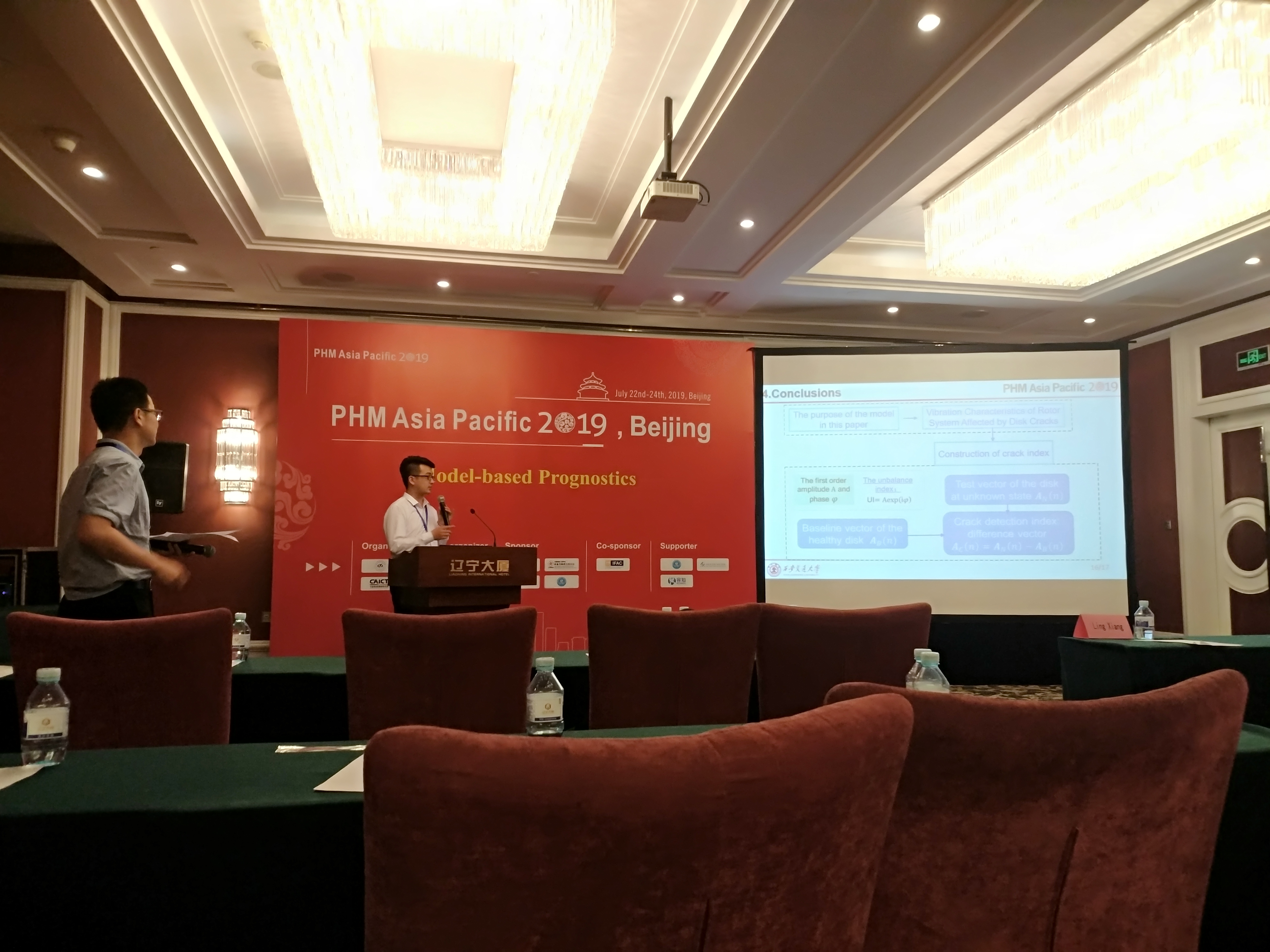 2019年7月,硕士生赵军参加在北京举办的PHM Asia Pacific 2019会议,并在Model-based Prognostics主题下进行了 oral presentation,报告题目为《Modeling and vibration characteristics analysis of disk cracks for aero-engines》。