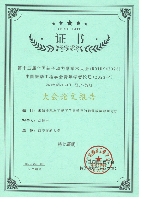 2023年4月,博士生刘佳宁参加第15届全国转子动力学学术会议,并作报告。题目为《未知非稳态工况下信息诱导的轴承故障诊断方法》。