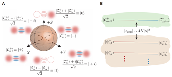 我的研究聚焦于猫态编码,如图1(a)所示,它将逻辑比特编码为相干态|±α>,根据正交性原理,X轴被编码为猫态。这种编码方式的比特被称为猫态比特。猫态比特在量子纠错中具有显著优势。猫态可以通过双光子驱动Kerr非线性腔(KNR)来实现,其能级结构如图1(b)所示。猫态子空间与高能级之间存在较大的能隙,这为猫态在编码子空间内提供了保护,从而使得猫态在该子空间内保持稳定。因此,我们可以仅在猫态子空间内分析由退相干引起的错误。在猫态比特的子空间内,XY通道的错误被指数级抑制,而Z通道的错误则线性增长,这种错误结构被称为偏置噪声 (biased-noise),它能够显著降低纠错开销。当猫态的尺寸较大时,可以认为系统仅受到Z通道噪声的影响,因此,在进行后续的量子纠错编码时,只需要使用一维重复码来纠正单通道错误,这大大减少了所需的物理比特数量,具有重要的应用前景。