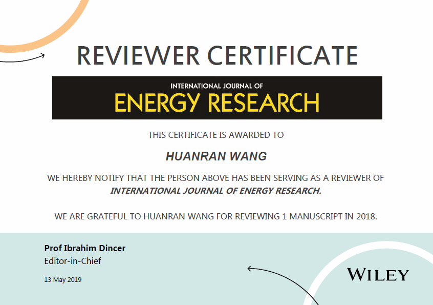 基于课题组王焕然教授在2018年对期刊审稿做出的贡献,International journal of energy research特发来审稿人证书并致谢意。