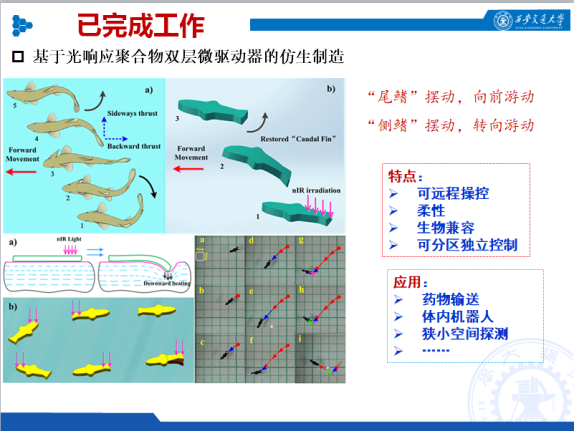 针对共性的问题,李大超博士深入开展驱动机理研究,并据此开展基于智能软材料的仿生驱动设计与优化研究,系统开展柔性多材料体系的控形控性及其一体化制造方法。提出了一种“多动模式仿生软体机器人的一体化制造与约束操控机制”。