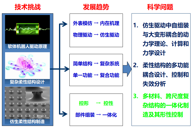 多功能软体机器人的制造方法的发展趋势是:从单材料制造向多材料制造发展、从宏尺度制造向宏/微/纳跨尺度制造发展、从控形向控性发展、从部件组装向一体化制造发展。因此,软体机器人制造方面面临的共性问题是:多材料、跨尺度复杂结构的一体化制造及其形性控制。