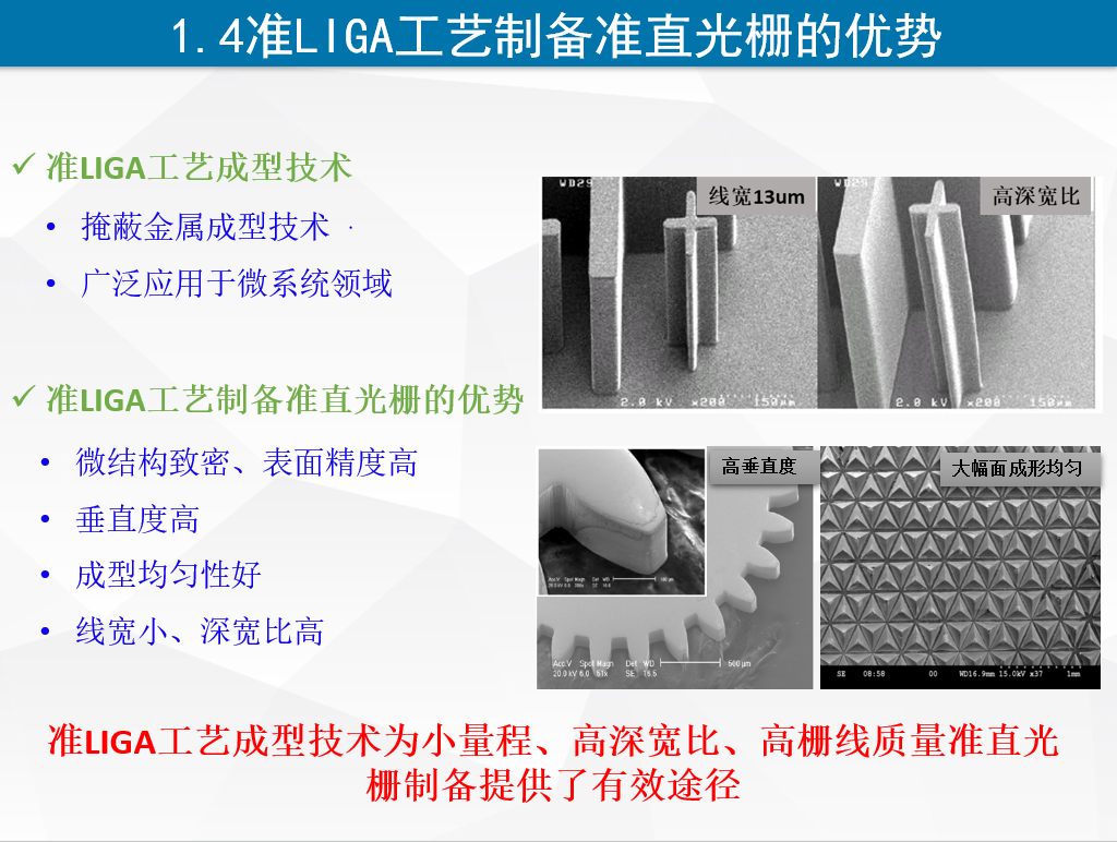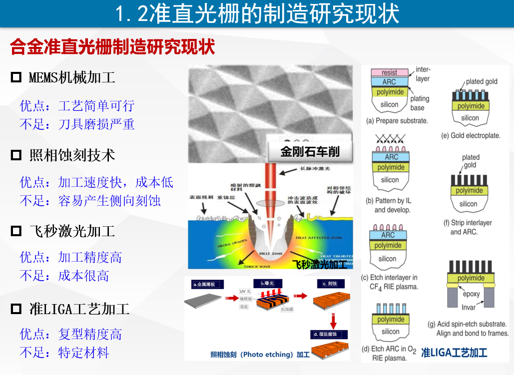 合金准直光栅制造研究现状是:MEMS机械加工向电沉积技术与光刻技术相结合。因此,共性问题是:大面积高精密全透式准直光栅关键部件的精密制造。