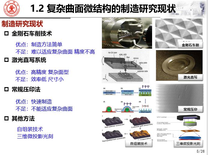 微纳米制造技术在过去二十多年的发展过程中已经成为引领科学技术发展的核心技术之一,引起了科学领域和工程领域的学者的高度关注。微纳米制造技术的发展带动了集成电路的发展,导致集成电路的集成度以每18个月翻一番的速度提高。现在,微纳米制造技术主要应用于平面衬底上。随着科技的发展,研究人员发现,自然界许多生物的表皮上充满某种排列方式的微结构,这些微结构可帮助生物实现某种功能,例如减小阻力,增强粘附力,润湿性,光学特性,调节细胞行为以及自清洁等功能。因此,越来越多的学者开始关注并研究生物中这些天然的微结构以及如何在曲面衬底上制备这些微结构。然而,由于现有的微结构加工工艺的制约,在大幅面的复杂曲面基底上制备出均匀性良好的微纳米尺寸级别的图案比较困难。