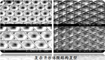对于复杂异形体结构的制造一直以来是一件比较困难的事情,采用机械加工方法或激光制作法,由于有热和力的作用,对微结构表面都会有破坏作用,因此需要找出一种简单高效的方法。采用复型制造的方法,可以精确的将微结构进行复型,这种方法成本低而且可以批量生产,对复杂异形体的复型制造是一种有效的方法。