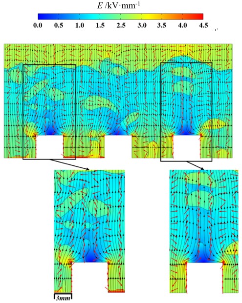 图2 电极结构电场强度分布和气泡运动轨迹