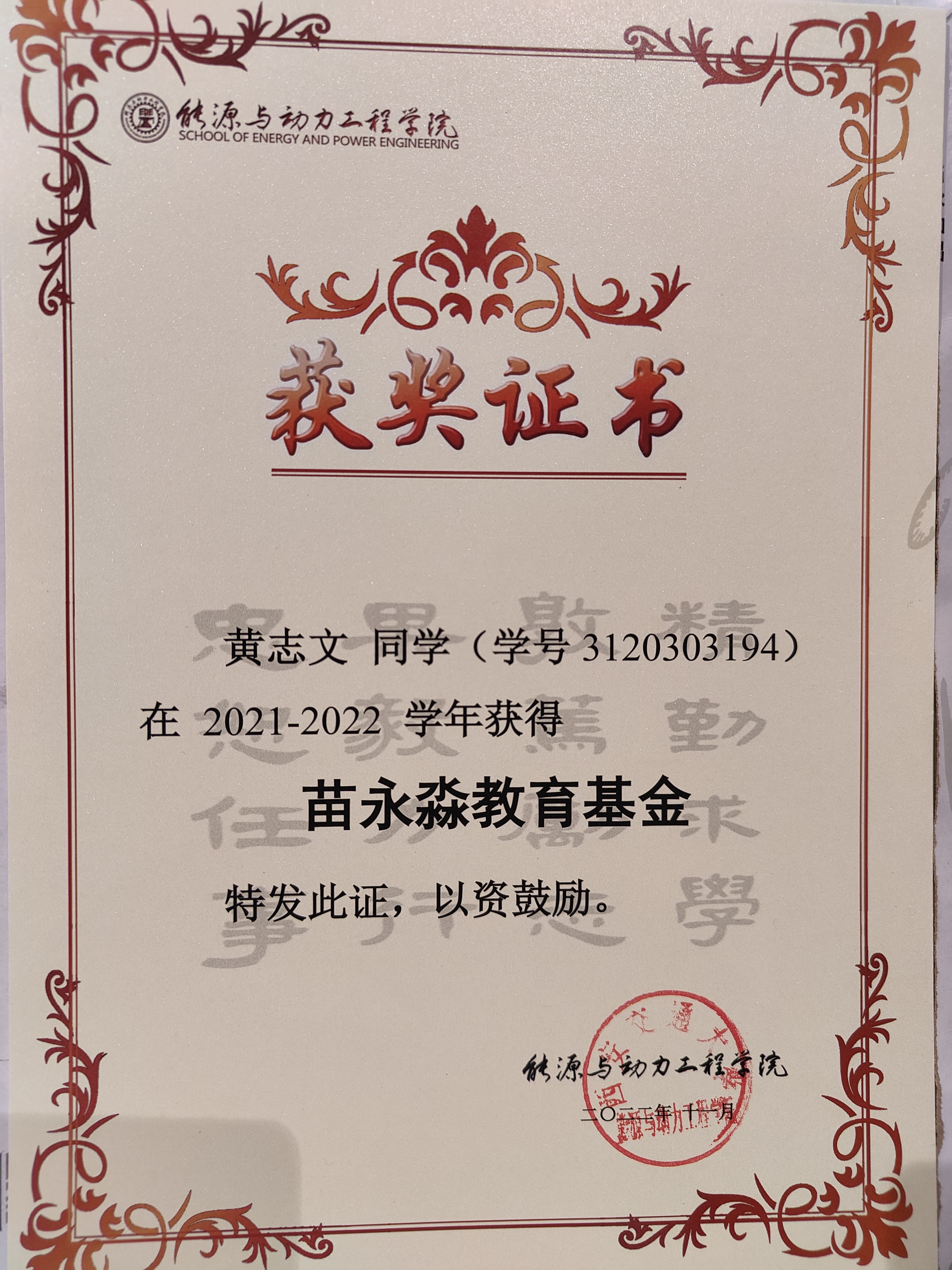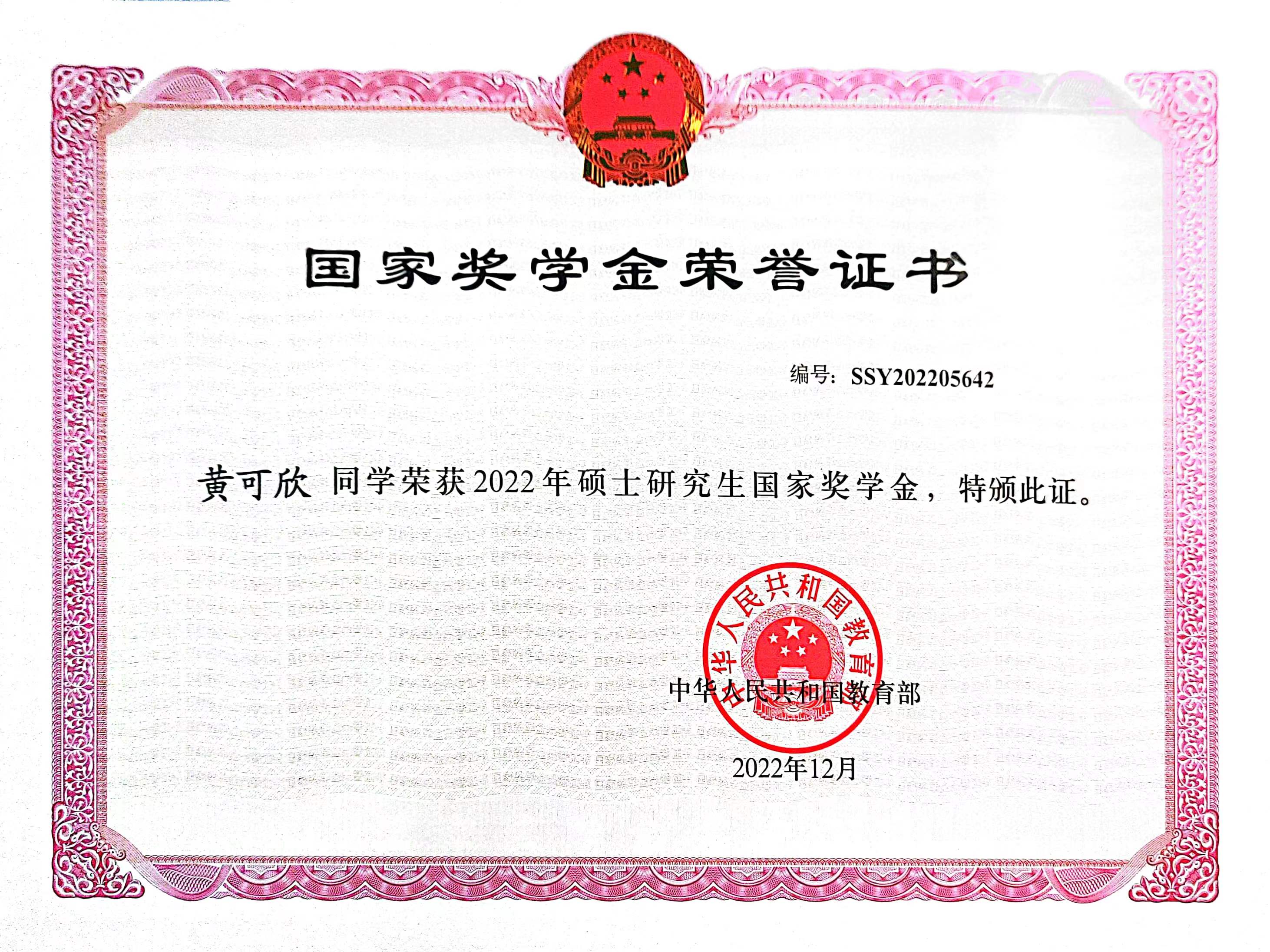 黄可欣获校级优秀硕士论文(2023) 黄可欣获国家奖学金(2022) 黄志文获苗永淼奖学金(2022) 黄可欣获光谷奖学金(2022)