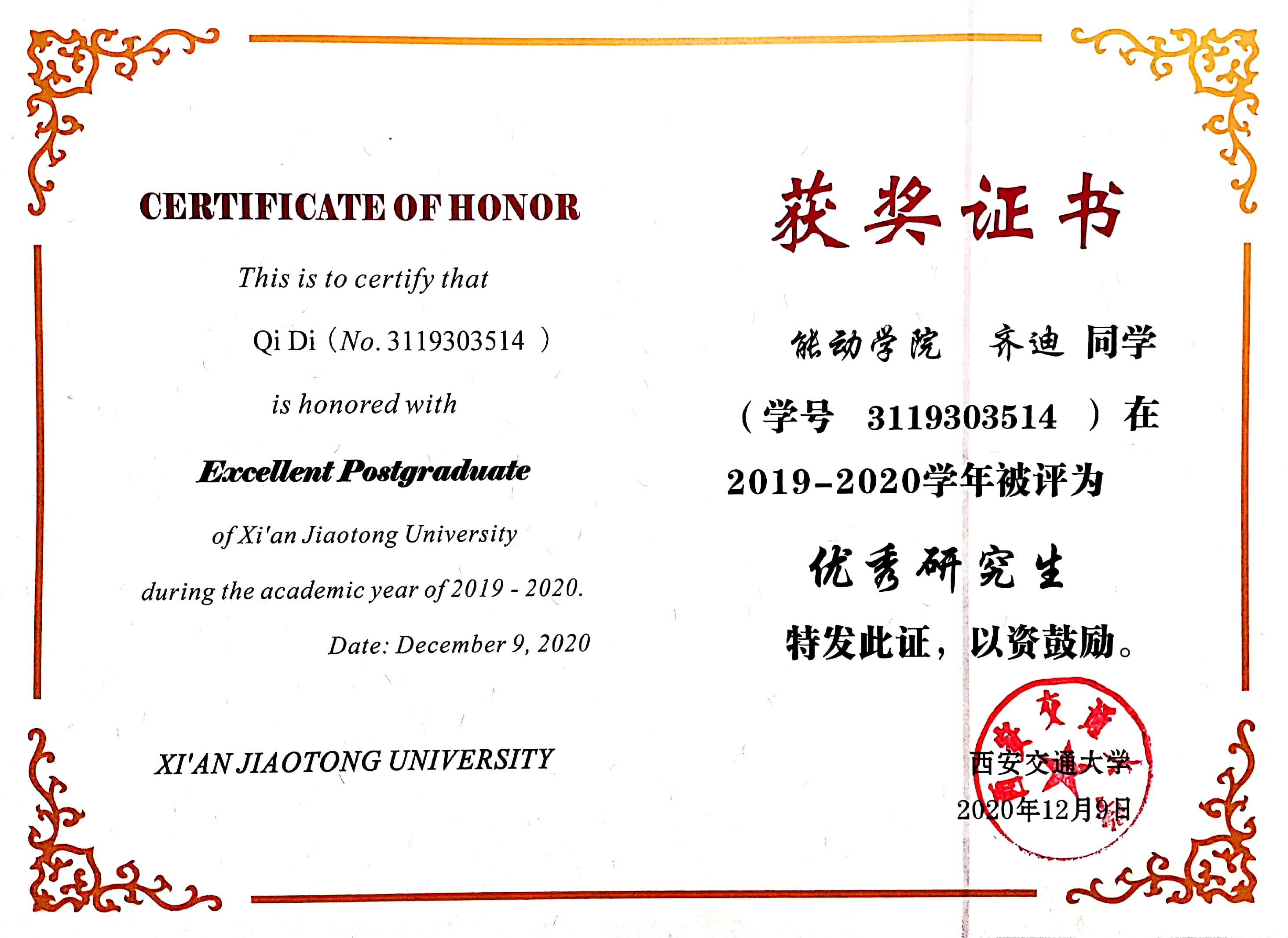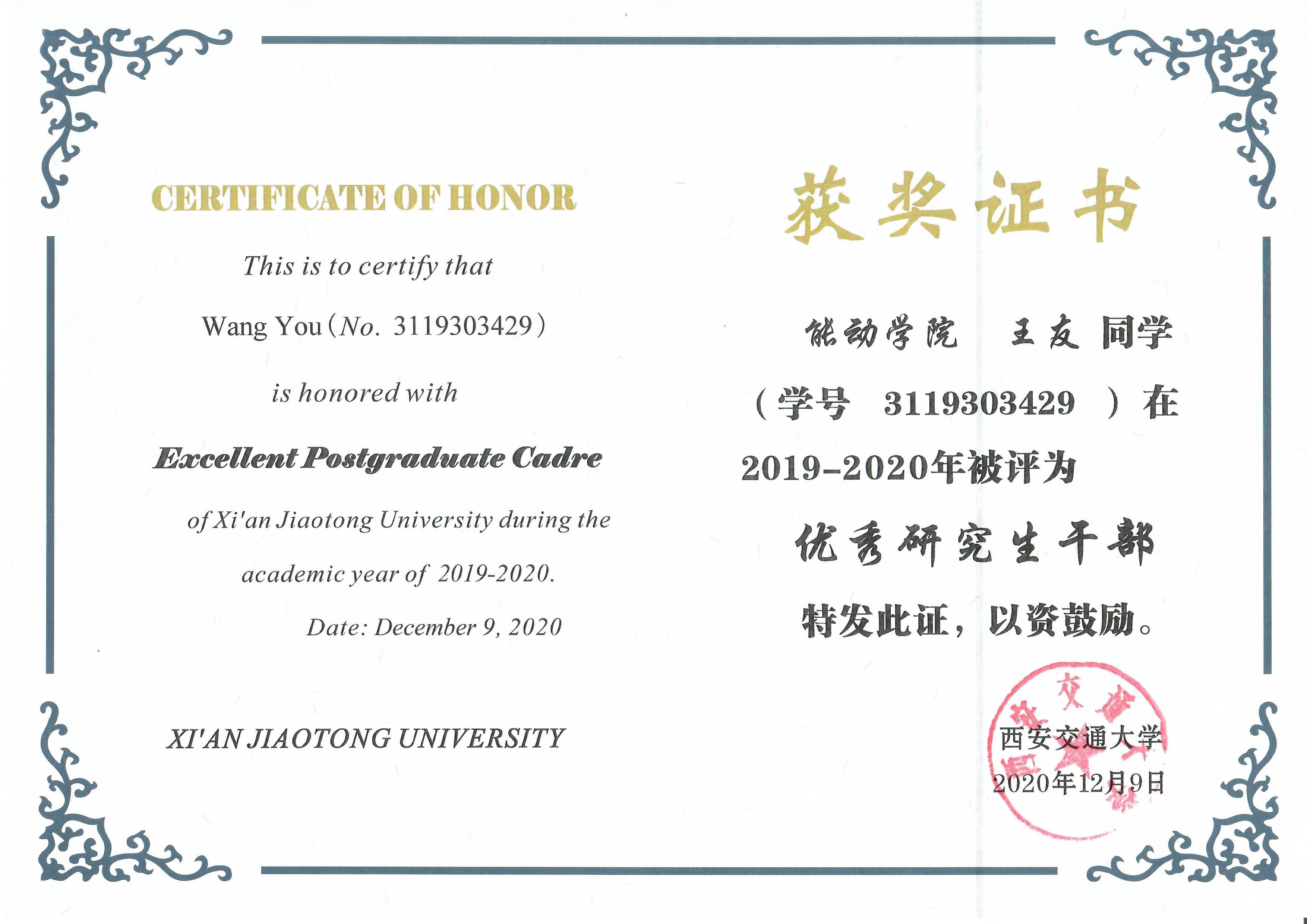 李彤-Best paper (2020) 齐迪-优秀研究生(2020) 王友-优秀研究生干部(2020) 朱子良-Best paper(2020)