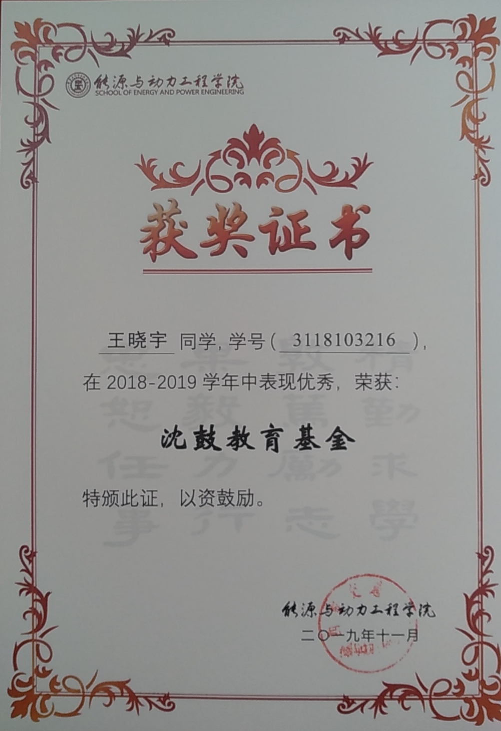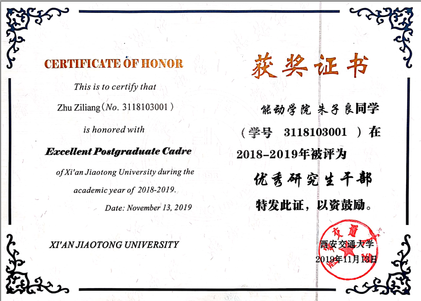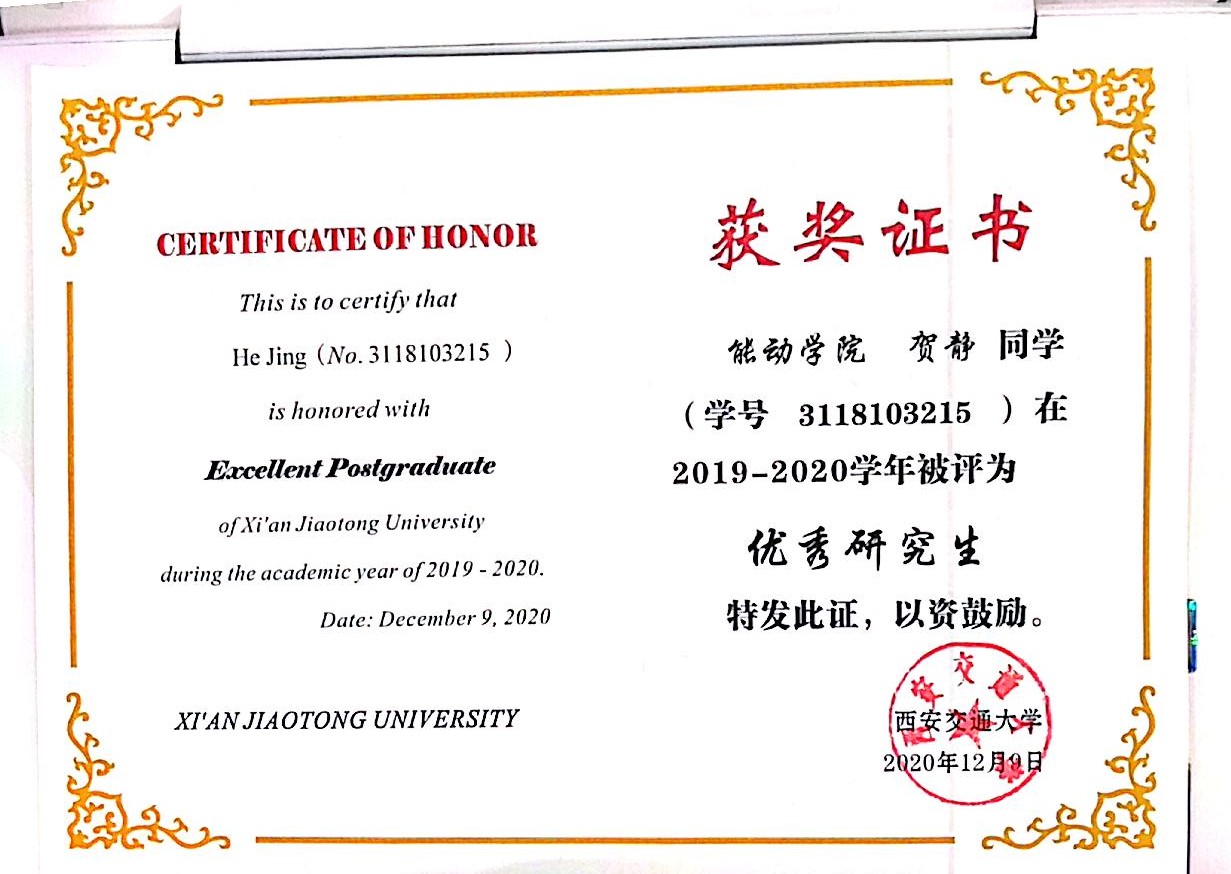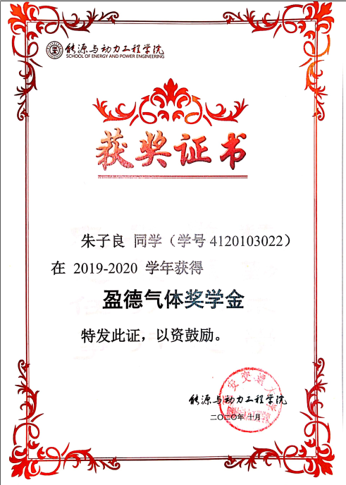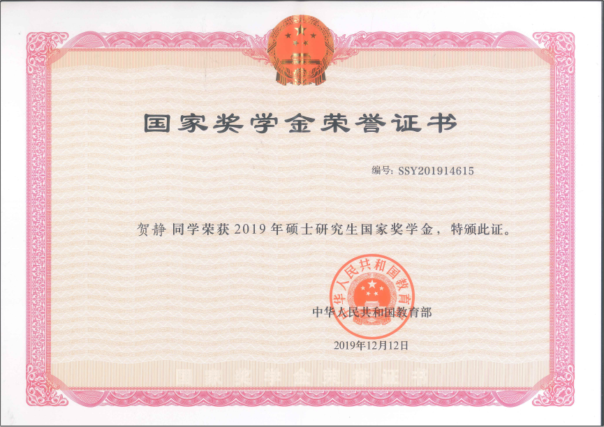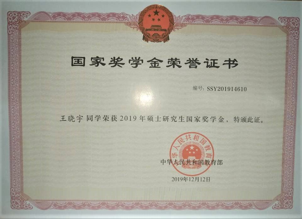 王晓宇-沈鼓奖学金(2020) 朱子良-盈德奖学金(2020) 贺静-国家奖学金(2019) 王晓宇-国家奖学金(2019)