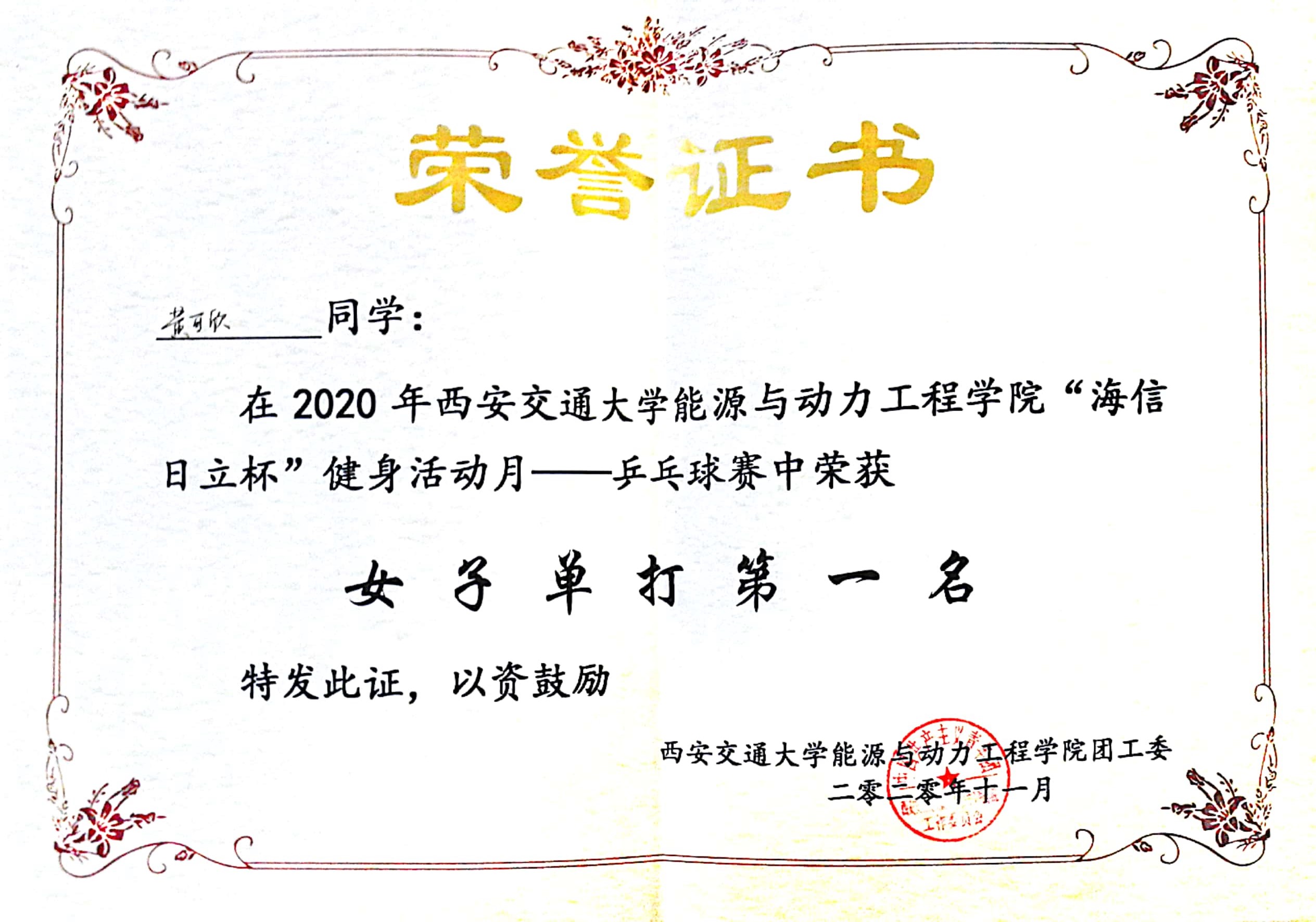 贺静-优秀研究生(2020) 李彤-优秀研究生干部(2020) 朱子良-优秀研究生干部(2020) 黄可欣-女子单打第一名(2020)
