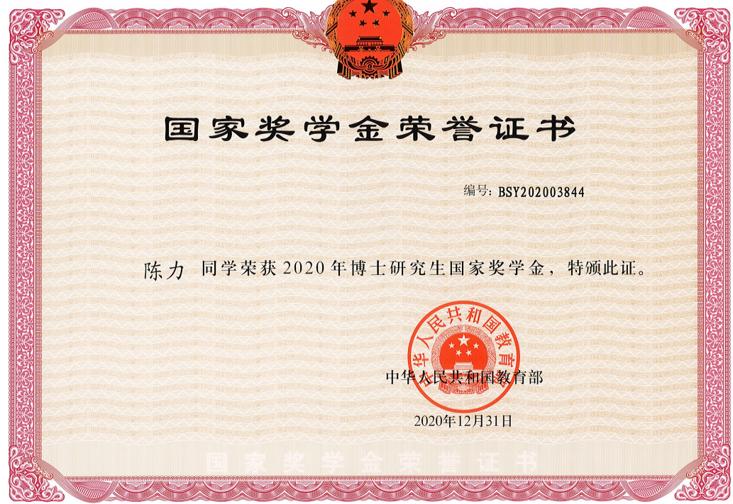 课题组博士生陈力、硕士生张子悦获得2019-2020年度国家奖学金。