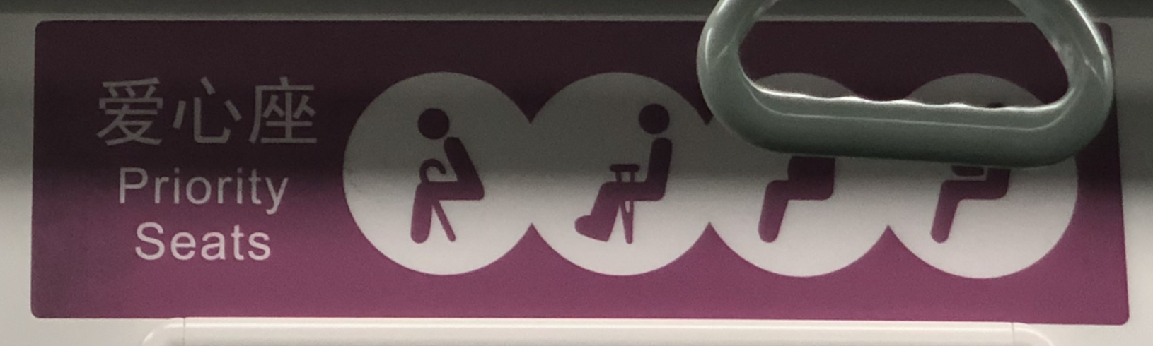 西安地铁有爱心座,座位是不同的颜色,翻译为 priority seat。是指给特殊人群的座位,表面上看也没什么区别。但是,从认知的角度看,它们的区别可能真不简单。