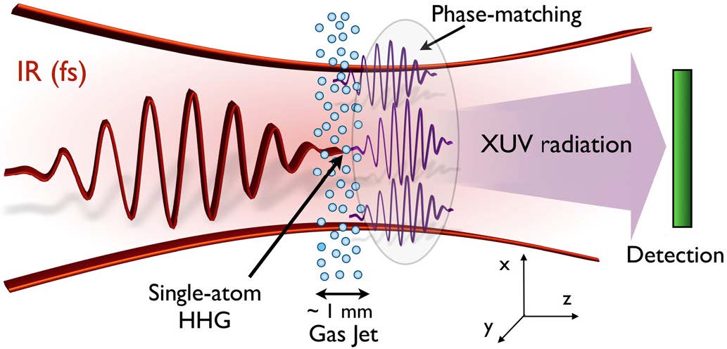 Fig 3 利用激光脉冲与分子相互作用产生高次谐波(左图);利用HHG实现超紫外阿秒涡旋(OAM)脉冲(右图)