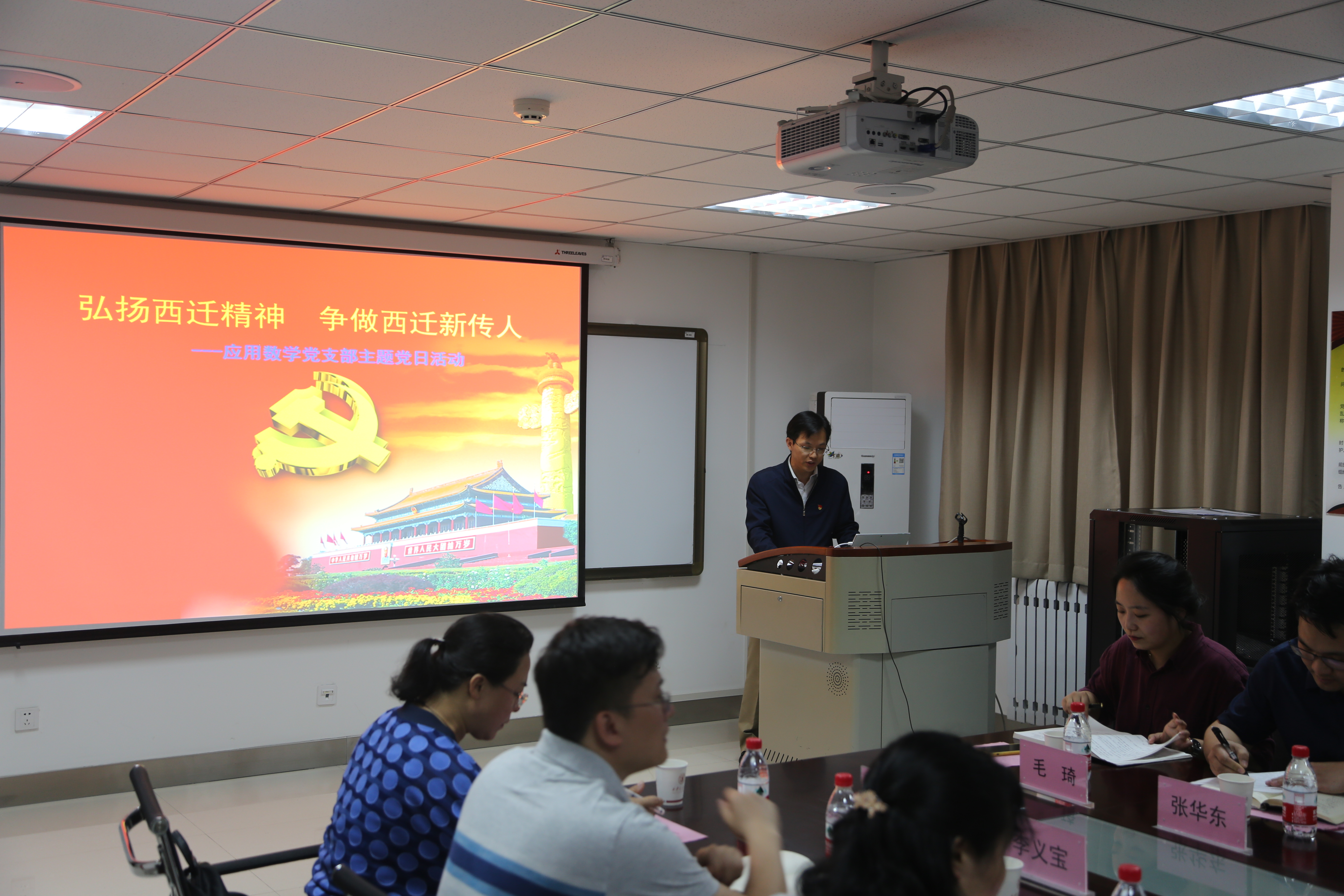 4月18日晚,数学与统计学院应用数学党支部召开了“弘扬西迁精神,争做西迁新传人”主题党日活动。郑庆华副校长参加会议,学院党委书记颜莉、应用数学博士党支部全体党员列席会议,会议由党支部书记祖建主持。