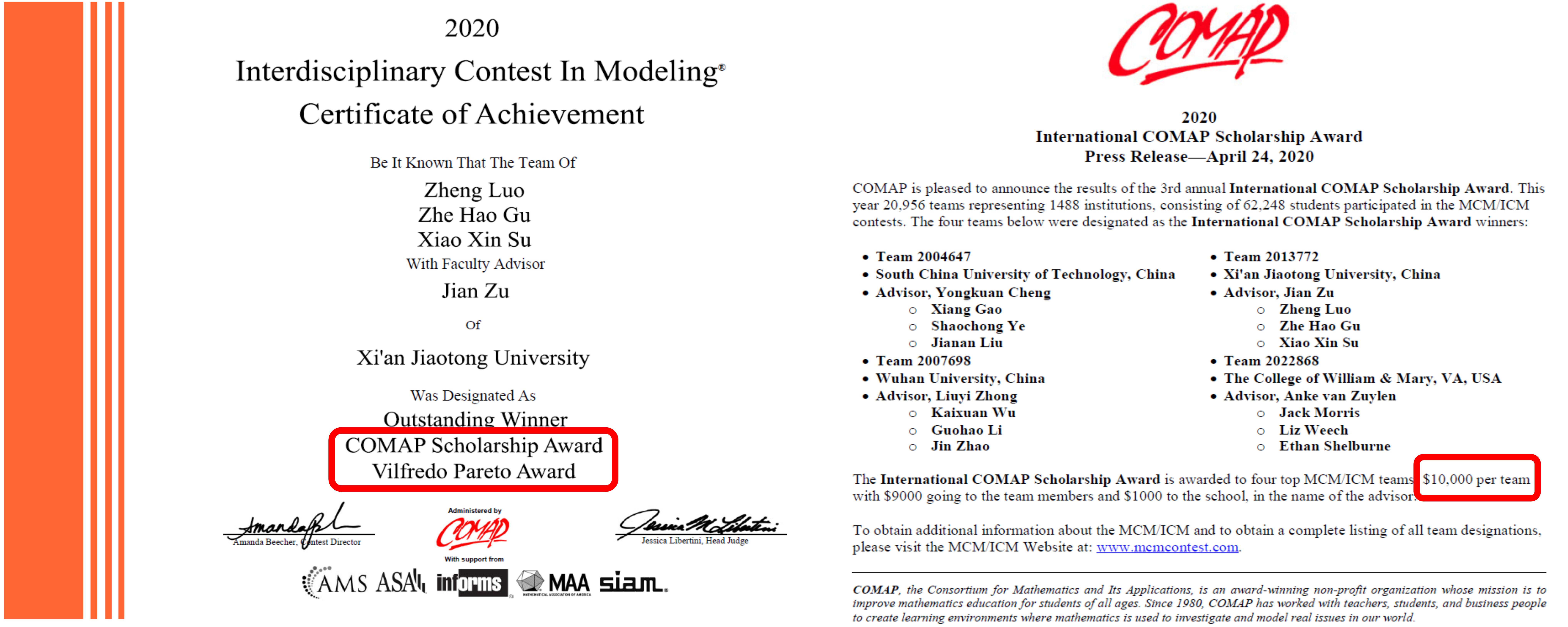 热烈祝贺罗蒸、顾哲豪、苏晓欣同学获得2020年美国大学生数学建模竞赛(MCM/ICM)Outstanding Winner和COMAP Scholarship Award & Vilfredo Pareto Award,并获得10000美元的奖金。