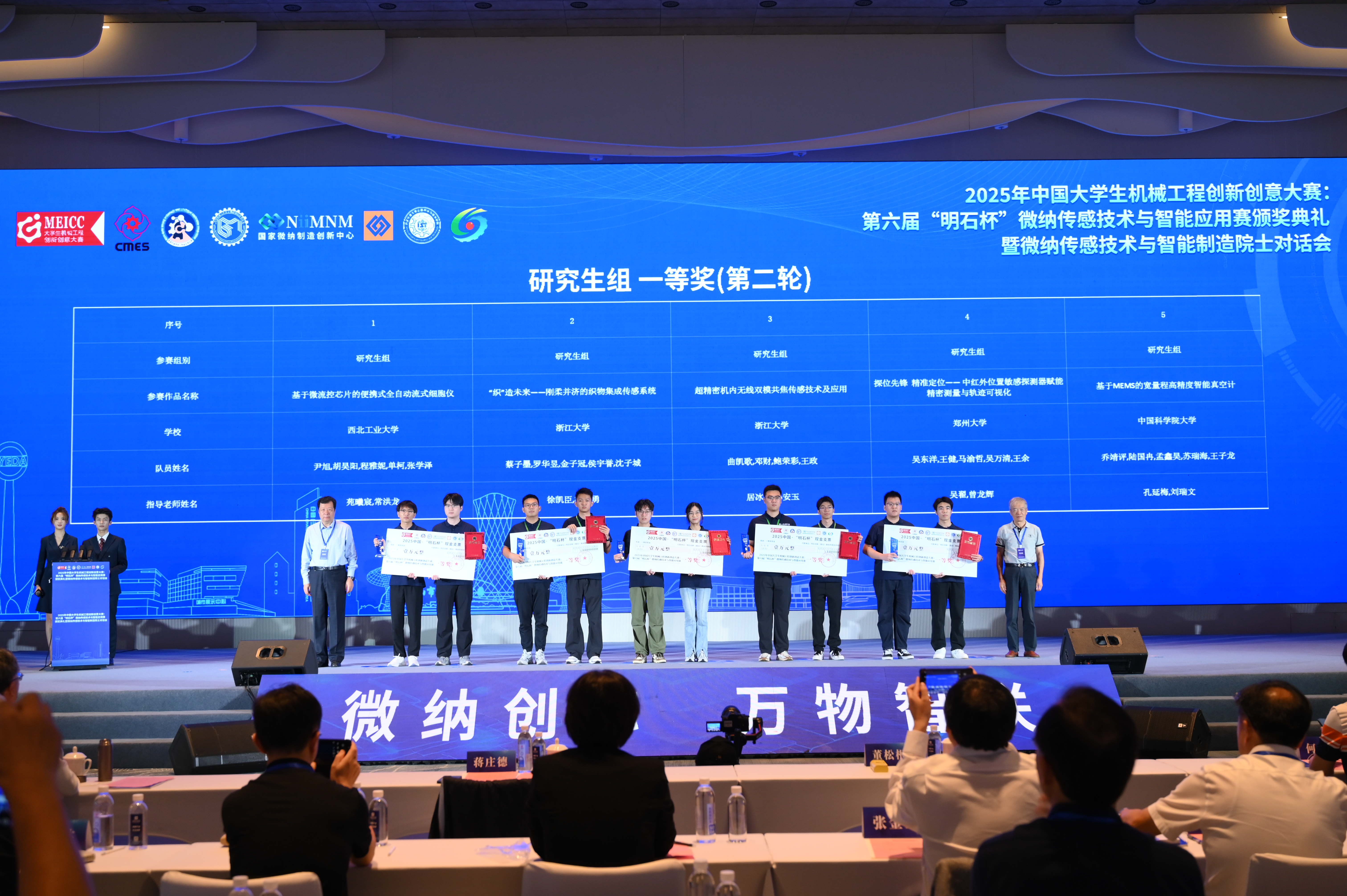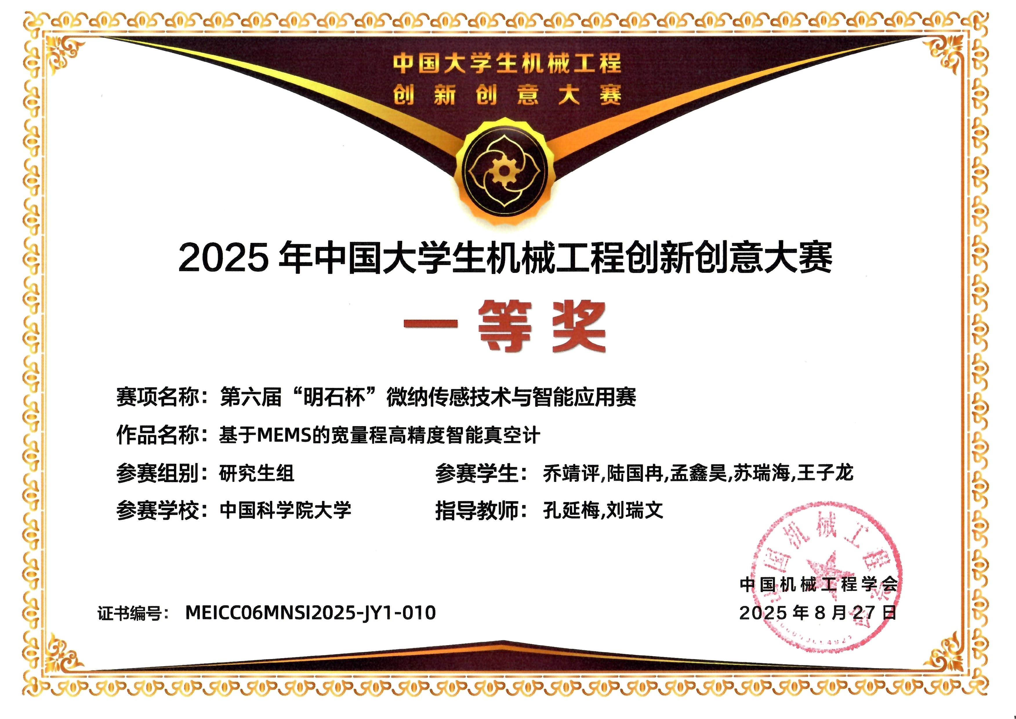 内容: 近日,由中国机械工程协会主办的2025年第六届“明石杯”微纳传感技术与智能应用赛全国总决赛于8月25日至27日在山东烟台举行,本次比赛共吸引来自全国各高校369项各赛区一等奖作品参加。本次总决赛研究生组共评选出一等奖10个,二等奖40个,三等奖28个。焦斌斌教授团队作品《基于MEMS的宽量程高精度智能真空计》在决赛中斩获一等奖。 作品简介: 针对高端装备对真空度传感器通用化、小型化与智能化的迫切需求,本作品首次将MEMS压阻、MEMS皮拉尼、MEMS谐振集成在单颗芯片,并基于集成芯片开发了微型真空度传感器整机,实现了宽量程和高精度的真空度检测(5×10-4Pa~0.1Pa@10%,0.1~5×103Pa@5%,5×103Pa~105Pa@2%)。基于芯片的特性,开发了一种气体识别策略,传感器能够同时实现真空环境下气体种类的识别和补偿,以提高传感器的环境适应性。 作品第一完成人乔靖评博士领奖 一等奖奖杯和奖状