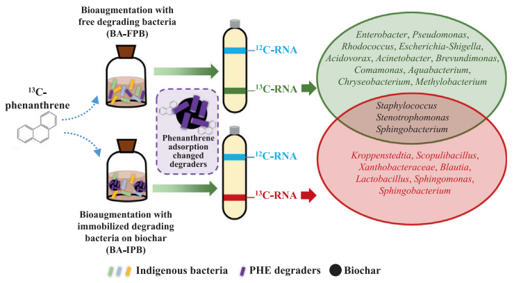课题组以农业废弃物(秸秆)和造纸废水处理厂的富铁污泥为原料制备的生物炭作为微生物固定化载体开发了PAHs降解菌剂,使得外援PAHs降解菌株在生物炭中具有较高的丰度,显示出明显的竞争优势,生物炭作为良好的PAHs吸附剂,可将土壤中的PAHs吸附到生物炭上,缩短了PAHs和微生物的接触距离,从而促进了微生物代谢活性的提升,显著加速了土壤中PAHs的生物降解。