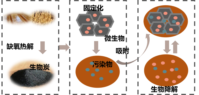 生物炭是生物质在缺氧条件下热解产生的多孔碳基材料,其较大的比表面积、较高的机械强度、发达的孔隙率和可调控的表面功能等有利于微生物的附着生长,从而保护微生物免受污染物和土著菌的侵害,以保持功能菌的活性和稳定性。