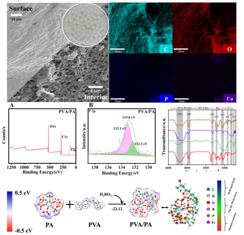 基于二元高分子聚合物的互穿聚合网络(Interpenetrating Polymer Networks,IPN)超分子自组装原理,成功合成了系列直径~3 mm的新型多孔的有机污染物吸附和生物固定化载体材料,如聚乙烯醇/壳聚糖(PVA/CS)、聚乙烯醇/壳聚糖/铁(PVA/CS/Fe)、聚乙烯醇/植酸(PVA/PA)、聚乙烯醇/植酸/铁(PVA/PA/Fe)、聚乙烯醇/ZSM-5沸石(PVA/ZSM-5)、聚乙烯醇/水化硅酸钙(PVA/CSH)等,形貌见图1。以PVA/PA凝胶珠为例(见图2),通过FTIR、EDS、XPS等分析及密度泛函理论(DFT)和分子对接模拟(Multiwfn和VMD软件)计算,发现PVA和PA分子间通过氢键(-HPO4-/-H2PO4-OH)和硼酸桥接(O-B-O键),自发形成了稳定的超分子共聚物PVA/PA(ΔG=-22.12kcal/mol)。材料制备工艺简单、常温常压、环境友好,产品柔韧多孔、密度和尺寸适中、吸附性能优异,生物亲和性好,具备推广应用潜力。