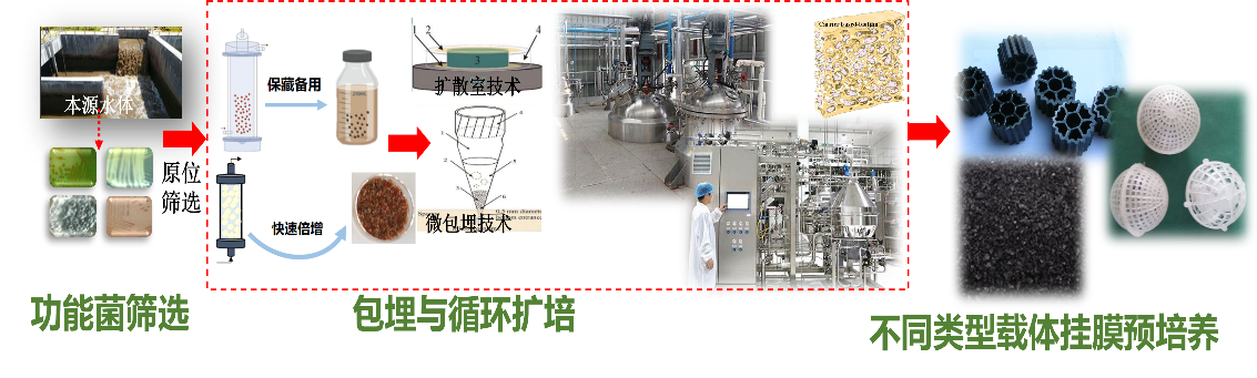 研究思路见图9和图10。通过环境功能材料的设计合成,开发制备了柔性多孔、生物亲和性佳、易破碎的功能微生物包埋材料,用于对特殊功能微生物的包埋培养。基于不同类型的特种微生物对底物和环境条件需求,为微生物提供适宜的培养条件,在生物反应器快速混合的水力条件下实现包埋微生物的快速扩大培养,这是因为:一方面强混合条件能克服底物传输的限制,另一方面,包埋体为微生物创造了相对稳定的微域空间(避免了强力水力剪切的扰动),因而得以快速繁殖,再将饱和生长的包埋体破碎后再包埋,进行循环扩培。随后,可根据不同水处理工艺(UASB、MBBR、IFAS、BF等)的需求,将扩培的特种功能微生物预挂膜在不同的生物载体上制备反应器接种或功能强化用菌剂。该研究具有普适性,可用于低温脱氮功能菌、生长缓慢的自养脱氮菌(如AnAOB和AOB)、毒性有机污染物降解菌(如PAHs和酚类降解菌)的快速扩大培养和应用。